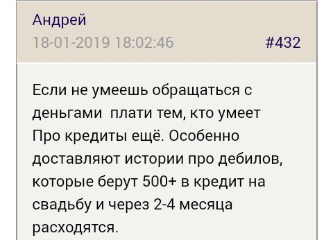 Alexey5005 Горелов написал: Вот смотрите. Беря потреб кредит(над), вы платите в "один конец" ,без возможности снимать ваши отданные деньги. Т. Е. ,взял я на 2 года Технаря 1200 ,и можно быть спокойным,что ровно чрез 2 года,(а может и ранее,в случае досрочного погашения,), мною будут выплачены 40000 рублей. С картами иной случай. Вы имеете возможность снимать с них ,сколько хотите и когда хотите,лишь бы был внесен минимальный ежемесячный платёж. Далее,е ли банк видит,что вы,паинька,и у вас нет просрочек,вам могут увеличить лимит ,"помогая" жить красиво. На что в нашей полунищей стране ведутся многие,и всем им нужны деньги,так как красиво жить не запретить . Их аналитики все зто посчитали и получили за это свои гроши. В результате ваша ямка выросла с 60000 до 90000.(то есть тридцаточку банк подкинул к праздникам. и пожелал вам приятных выходных. Через пол года ваш любимый банк снова видя что вы паинька,хоть и осунулись уже внешне,на что им насрать,снова к другим праздникам решили осчастливить вас ,увеличив кредит ещё на тридцаточку. И вот вы уже со 120000 условных и потраченных рублей,с ежемесячной минимальной выплатой 11000 .,где большая часть - проценты,а 2- 3 тысячи идёт на покрытие,которые вы все равно снимаете потом. Исключение одно - железная воля владельца карты и платежи не минимальные допустимые а более и желательно в сроки беспроцентных чисел. Тогда ямы нет. Но это большая редкость,вычисленная анал тиками. |