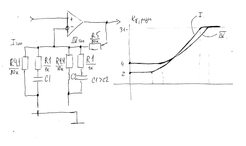 Исходная картинка, которую все время зачеркивает Партагас - правильная. (просто для упрощения схема была приведена без учета изменения Ку для разных лент, но на картинке все учтено!) Специально для Партагаса я нарисовал схему как должно быть чтобы схема точно соответствовала картинке. Она представляет из себя по сути ФВЧ. Поведение АЧХ в полосе пропускания (правая верхняя часть картинки) определяется R1C1 и R1C2 (это есть частота настройки или частота среза и у меньшей пост времени она больше). Поведение АЧХ в полосе задерживания (левая нижняя часть картинки) определяется R4.4C1 и R4.1C2 (это есть частота начала подъема АЧХ). |