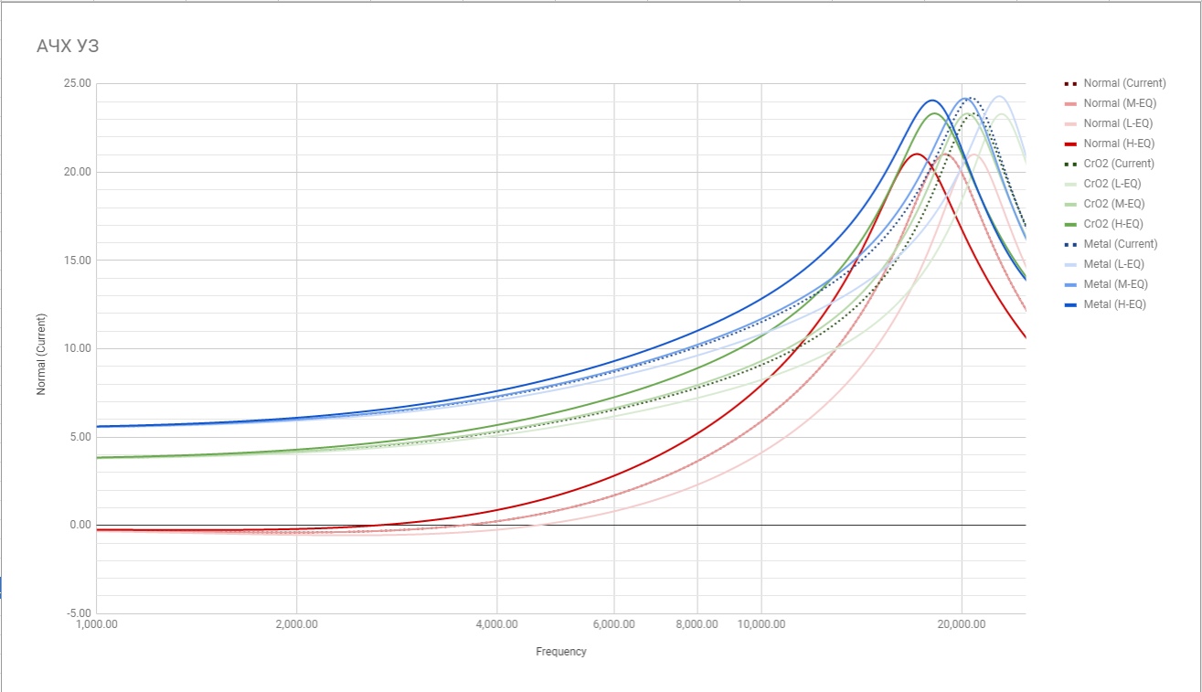 Вы опять читаете по-диагонали. Несколько страниц назад было написано, что это кусочно-линейная аппроксимация, крутизны в явном виде нет, но косвенно она заключается в пересечении графиков. Как выглядит на самом деле нарисовал от руки.  Ближе всего мою картинку повторяет график реализации коррекции в магнитофоне Тик-1050. Даже цвета такие же. :laughter:
