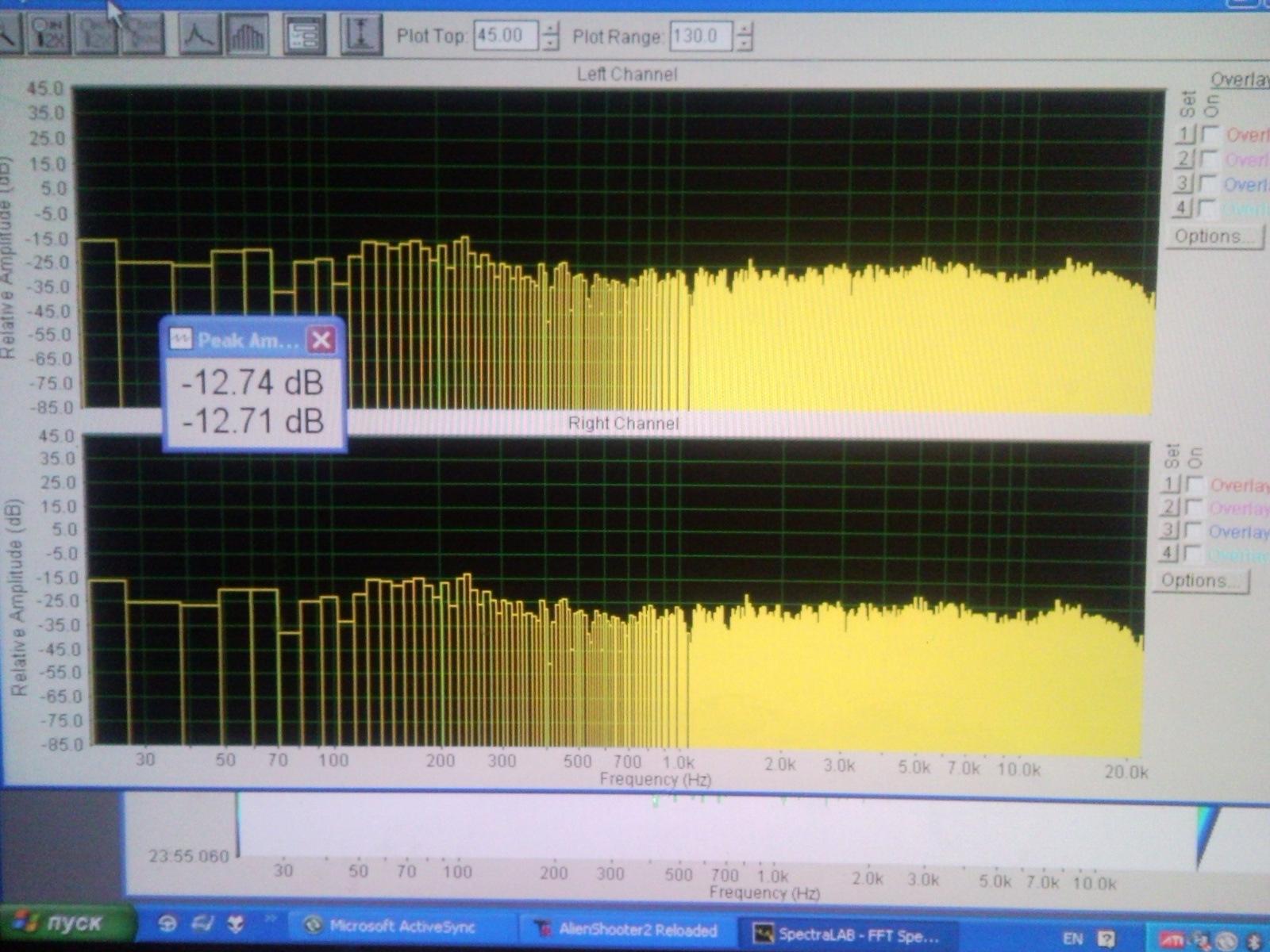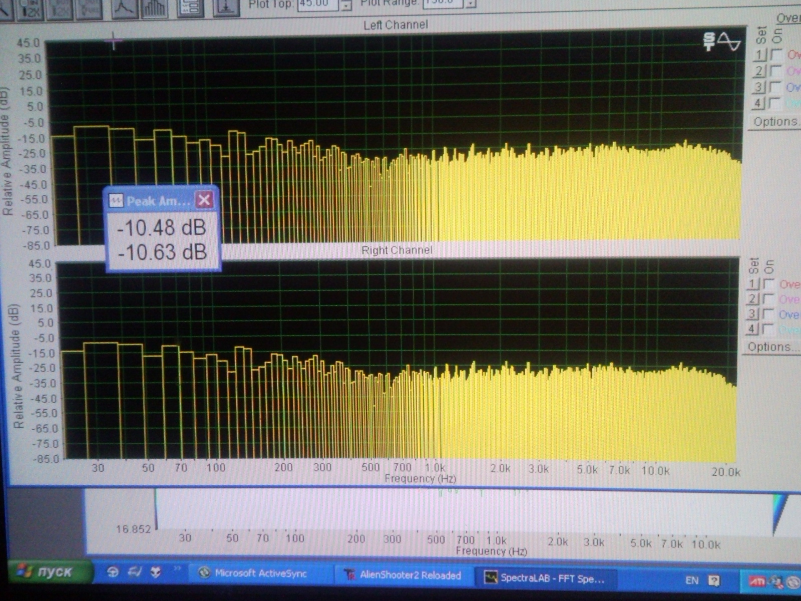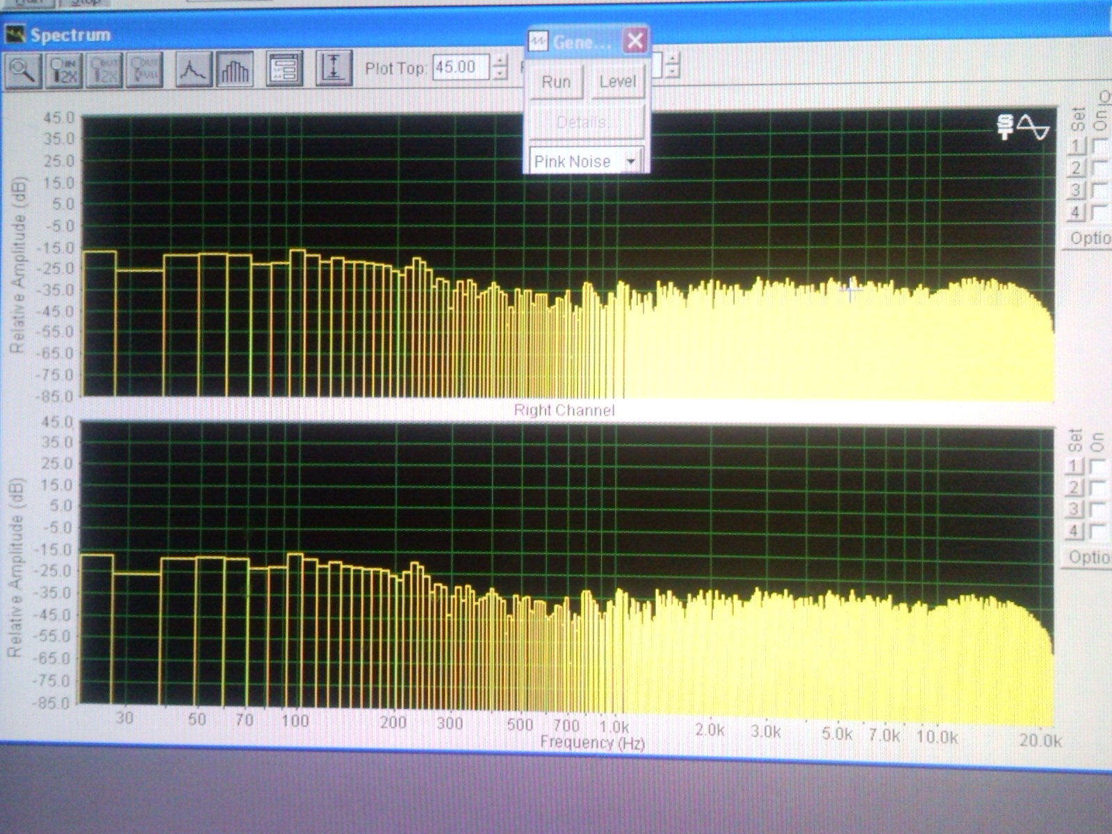 Это запись розового шума , воспроизведенная на грюндиге и меридиане . Уровни , я , записал разные : -12 ,-20 ,-40 ,-60 дб . Картина везде аналогичная . Интересовал конечный результат , косяки в записи всякие другие подробности не интересовали , учитывая условность этих измерений . Так же был свип частотный , уровневый , 1кгц и т.д. В общем эта спектрограмма лишь подтвердила бесполезность всяких измерений в отношении кд плееров , на слух у грюндига низ гораздо глубже и артикулированней чем у меридиана , а из спектрограммы можно понять , что там провал .) Единственно что у меридиана уровень выше , чем у всех плееров на 3дб , но это трюк производителей , что бы покруче звук был и сразу выделялся .