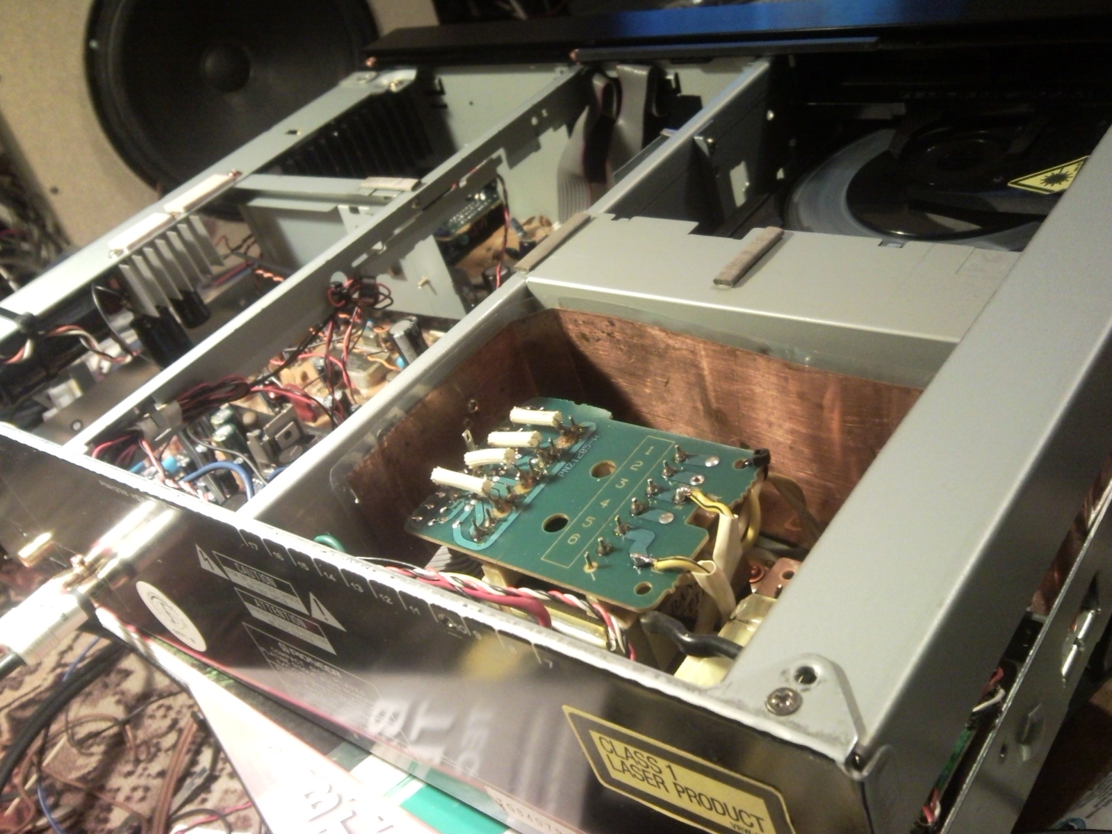 Результат удивил. Даже очень. Если до переделки чем больше слушал, тем больше сомневался, даже в розыгрыше Михаила подозревать стал, то сейчас процесс пошёл в противоположном направлении. Сразу после включения я позвонил Михаилу, отчитался в проделанной работе и сказал, что стало заметно лучше, а теперь, после полутора часов прослушки, уточню - ОЧЕНЬ заметно лучше. И чем больше слушаю, тем больше удивляюсь. Неожиданный и непривычный звук с новыми деталями, новой музыкальной информацией и приятным тембром. Насколько лучше или хуже моих других проигрывателей пока затрудняюсь сказать. Надо время, чтобы впечатления улеглись. Но СД звучат по новому, хоть всё подряд заново переслушивай. Да, ещё выдернул кабель идущий к дисплею. Дисплей всё равно дефектный, а так и дефект не видно, и помех от дисплея не будет.