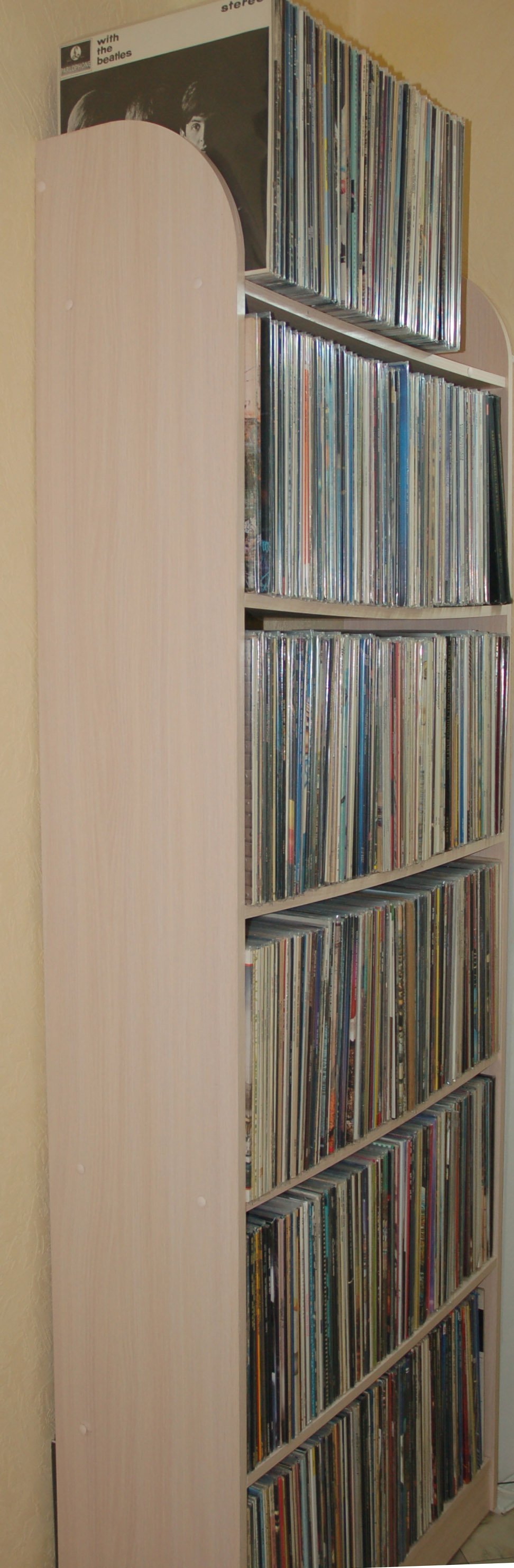 У меня раньше выглядел вот так. Сейчас заказал: во-первых до потолка (это будет 7 рядов), во-вторых: в два раза шире (кол-во вмещаемых пластинок удвоится), ну и обязательно перегородки - полки под весом прогибаются. Уже делают. Цвет - бук. |