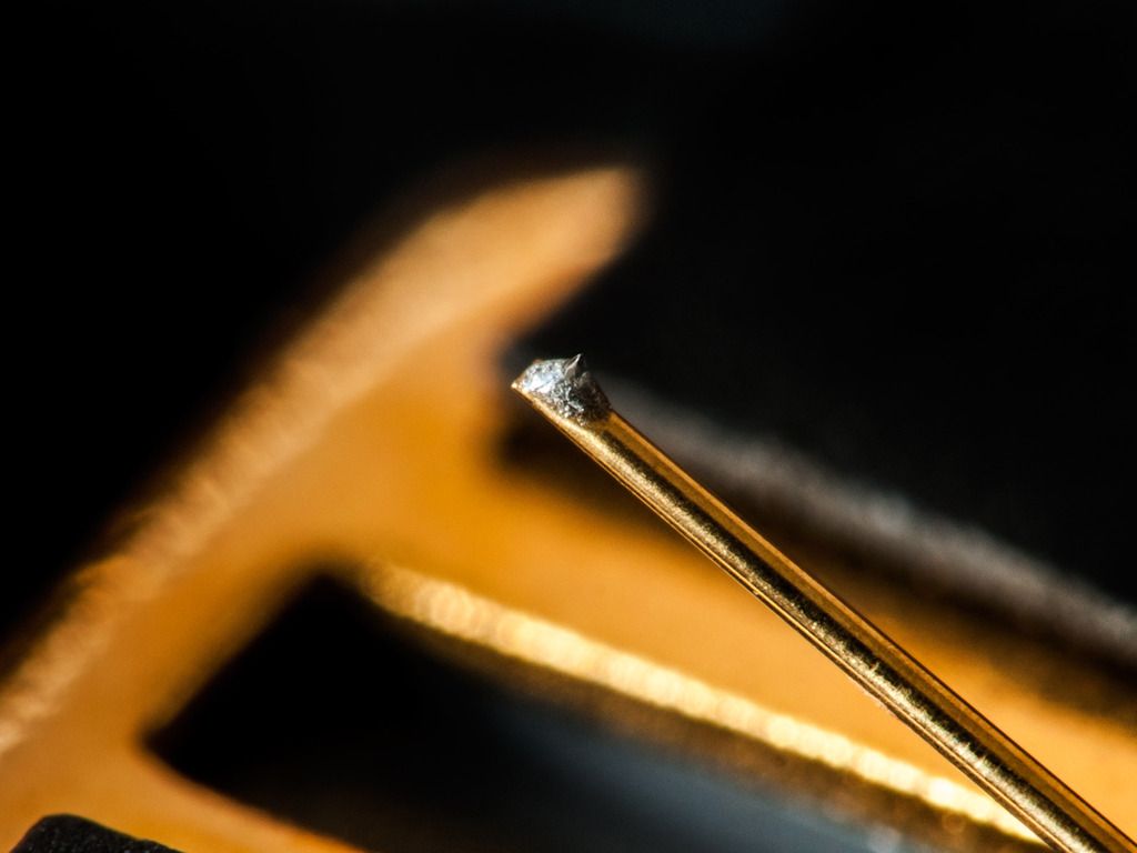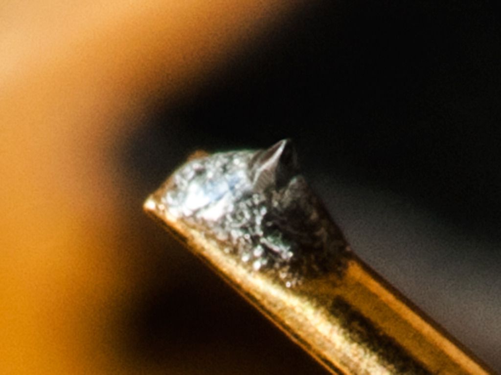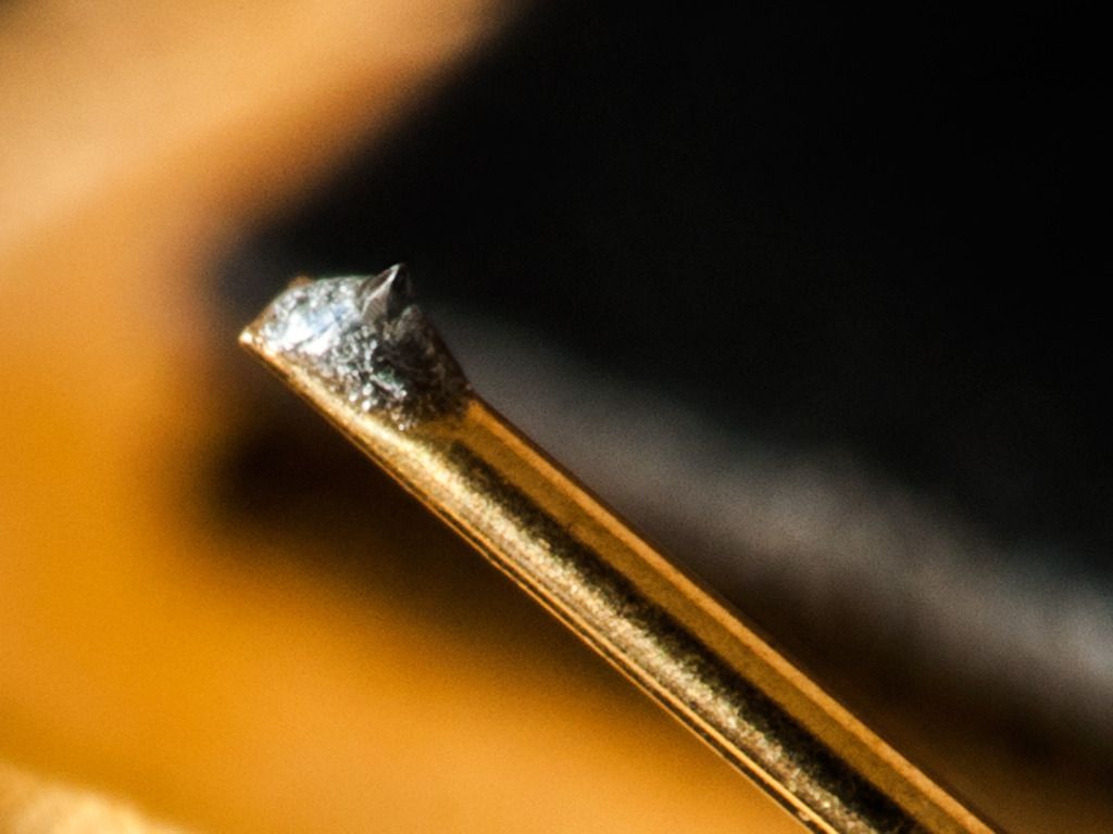 Вот, на картинке кружочком обвел область, которую хотелось бы рассмотреть. Там где происходит соприкосновение иглы с канавкой. От вершины примерно 20 мкм. А само ребро в ширину - 5 микрон.