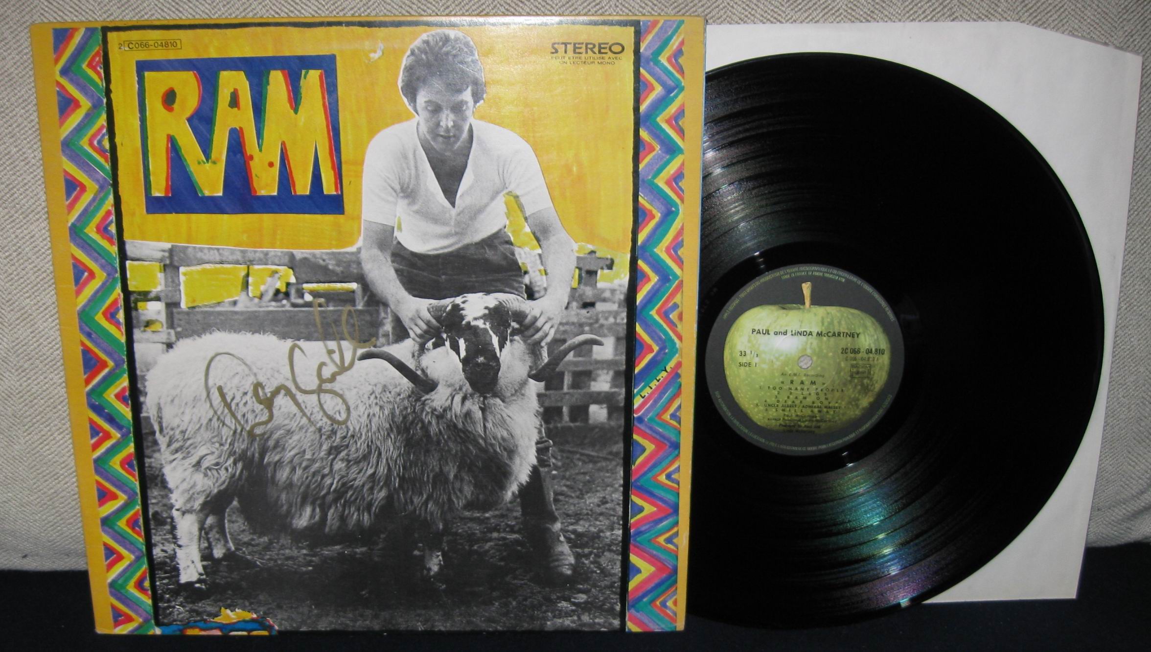 PAUL & LINDA MCCARTNEY McCartney (Rare 1973 UK 14-track vinyl LP, pressed in France by Pathй Marconi when the EMI plant was undergoing refurbishment; the Apple labels state both 'Mfd In UK' & 'Made In France By Pathй Marconi'. There is a slight lip curl in the lower half of the laminated gatefold but otherwise this is a superb copy PCS7102).