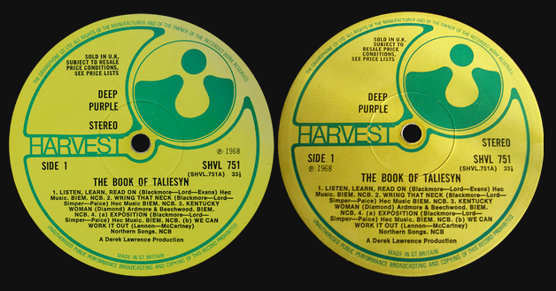 Судя логике, первый пресс тот, который выставил Вадим Малахов. Второй, который выствил в сравнеии с ним Сергей Иванов. Третий, был точно такой, с правой надписью Sterеo, но уже без Solid in UK. Четвёртый, тоже безэмишный, но надпись DEEP PURPLE в одну строку. Пятый, уже с лого EMI. Но все грамофоновские пресса были с одними матрицами A-1G/B-1G