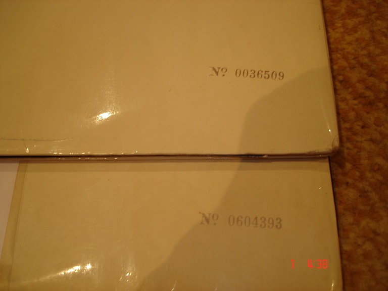 Нашел вот такую информацию: Although the sequential numbering of the covers remains somewhat of a mystery, it appears that the first 300,000 numbers were generally held for mono covers, and the numbers 300,001 to 600,000 were held for stereo. The first 300,000 numbers were not used exclusively for mono covers. Some numbers in the 200,000 to 300,000 range were used for stereo covers paired with export albums having Parlophone labels. Some later mono covers were printed with numbers over 600,000, perhaps as high as 630,000. Хотя последовательная нумерация обложек остается своего рода тайной, похоже, что первые 300.000 номеров, как правило, предназначались для моно изданий, а номера с 300001 до 600000 для стерео. Однако первые 300,000 номеров не были использованы исключительно для моно изданий, некоторые номера в диапазоне от 200 000 до 300 000 были использованы для стерео и для экспортных изданий с этикеткой Парлофон. Некоторые более поздние моно обложки были напечатаны с номерами более 600000, возможно до 630000. На моем стерео номер 0317031 ![]() |