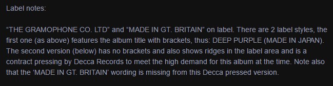 “ГРАММОФОН СО. Ltd” и “MADE IN GT. BRITAIN” на этикетке. Есть 2 типа пятаков, первое (как выше) Название альбома итд…: Deep Purple (сделано в Японии) в скобках.