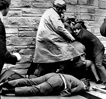 ещё один через месяц приедет из штатов с автографом Джона Хинкли Младшего. Пресс-секретарь Джеймс Брейди лежит раненый на тротуаре, в то время как сотрудники полиции и агенты секретной службы повалили Джона Хинкли Младшего на землю. |