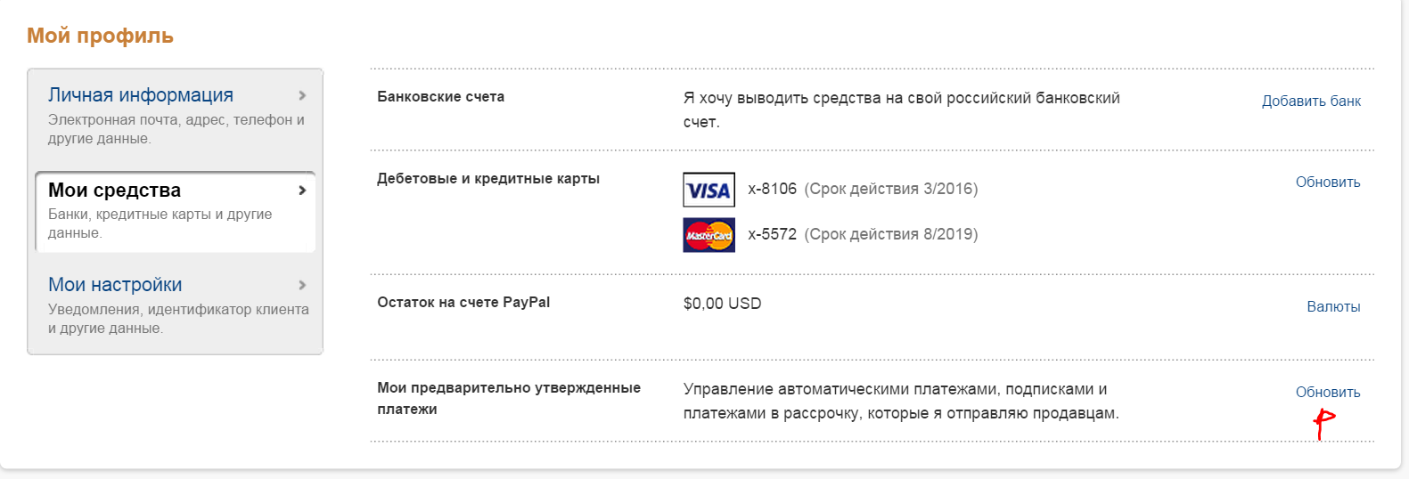 Устанавливая флажок "главная валюта рубль", видна сумма со счёта, но устанавливая "главная валюта доллар", фигурирует 0,00. Задал вопрос. Из ответа ясно, что всё это хрень. Получается, доллары могут оказаться на счету если их мне кто-то пришлёт? Здравствуйте, Изя Зоенлихт! Благодарим за обращение в PayPal в отношении возможности перевода средств на остатке учетной записи. Рассмотрев Вашу учетную запись PayPal, хочу отметить, что Ваш счет прошел проверку Вы можете держать остатки на счете PayPal отдельно в каждой валюте. Список поддерживаемых валют можно найти в Соглашении с пользователем, которое доступно по ссылке «Юридические соглашения» в нижней части любой страницы PayPal. Однако в соответствии с выданной компании PayPal лицензией НКО конвертировать средства из одного валютного остатка в другой невозможно. Если Вам отправили платеж в валюте, в которой у Вас не открыт остаток, Вы можете открыть остаток и принять платеж, либо отказаться от платежа. Важно помнить, что оплата по России возможна только в рублях независимо от того, прошел ли проверку Ваш счет. Мы всегда рады помочь. Спасибо за использование услуг PayPal. С уважением, Vasyl PayPal Авторское право © PayPal, 1999–2015 гг. Все права сохранены. Небанковская кредитная организация Общество с ограниченной ответственностью «ПэйПал РУ». Юридический адрес: Российская Федерация, 125047, Москва, ул. Бутырский Вал, д. 10. Деятельность осуществляется на основании лицензии Центрального банка России № 3517-К.