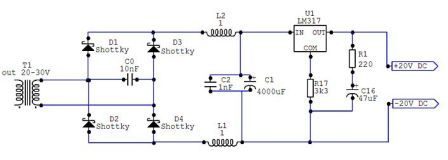 Поскольку конкретный блок мы делаем под корректор, выходной напряжение - постоянные 20V - будет стабилизированное (LM317). Самая общая схема блока питания со стабилизатором приведена на следующем рисункке.