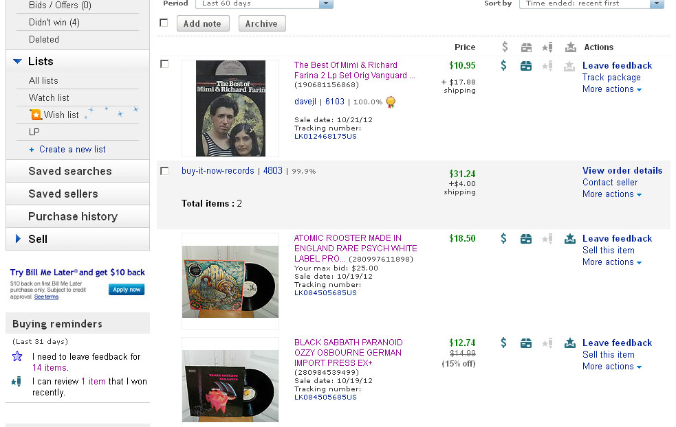 С марта по сегодня - больше 100! Дорвался. Дело в том, что раньше я мучил дочку и здесь моего друга, хотя он не возражал. Я покупал, играл и отсылал ему ссылку. Он платил и указывал мой адрес. При встрече я отдавал ему налик... А в феврале пошел и сделал себе Визу и МК. И понеслась душа в рай... А шопоголия это тоже болезнь... Только печень от нее не страдает, голова не болит и руки не трясутся. А в последнее время я из вредности перебиваю лоты других - кликнешь чириком на седьмой секунде и оно твоё! Вон выше на фотке, Атомик Рустер промо отобрал у кого-то...