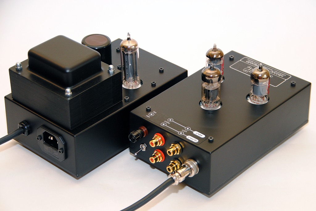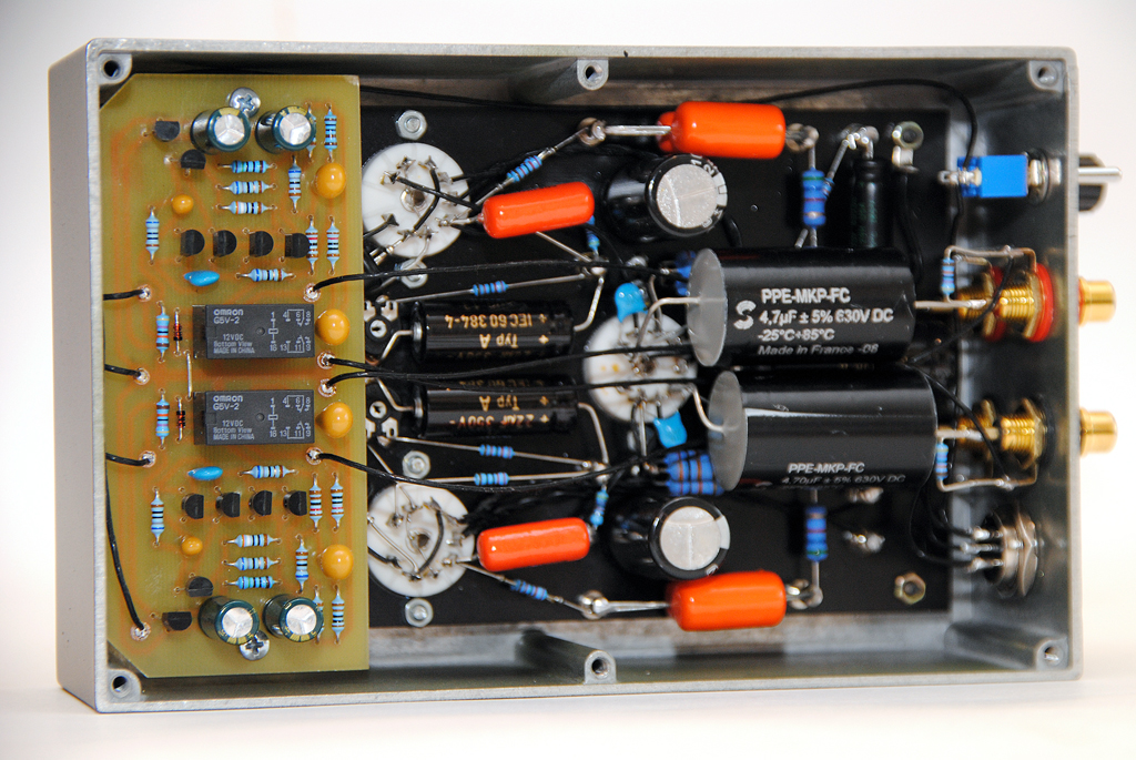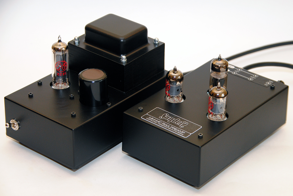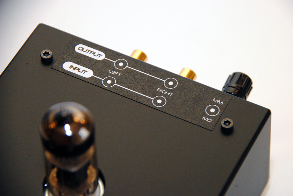 Корректор на лампах EF86/6Н6П с блоком питания на кенотроне EZ81. В корректор встроен МС предусилитель на транзисторах. Такое решение было выбрано исходя из того, что владелец получит возможность попробовать в своей системе МС картриджи без больших затрат на повышающие трансформаторы. Т.е. для начала приобрести недорогой картридж и понять для себя, нужен ли, вообще, переход на МС, а затем спокойно заняться выбором картриджа и трансформатора под него.