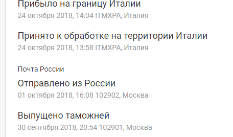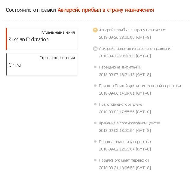 Как-то купил на ибее одну вещицу в Гонконге. Трек-номер отслеживался только китайской почтой, а Почта России его не "видела". Через пару недель после отправления китайская почта бодро отрапортовала, что отправление уже прибыло ко мне в город и даже передано для доставки какому-то неведомому курьеру. Естественно, знать это они не могли, поскольку отслеживали свой трек-номер только до границы, а Почта России их трек-номер не отслеживала и по определению ничего сообщить им не могла. Конечно же, никакой курьер ко мне не пришёл ) В реальности оправление поступило только через месяц-полтора. |