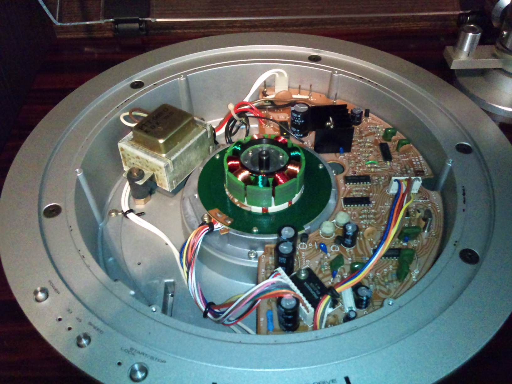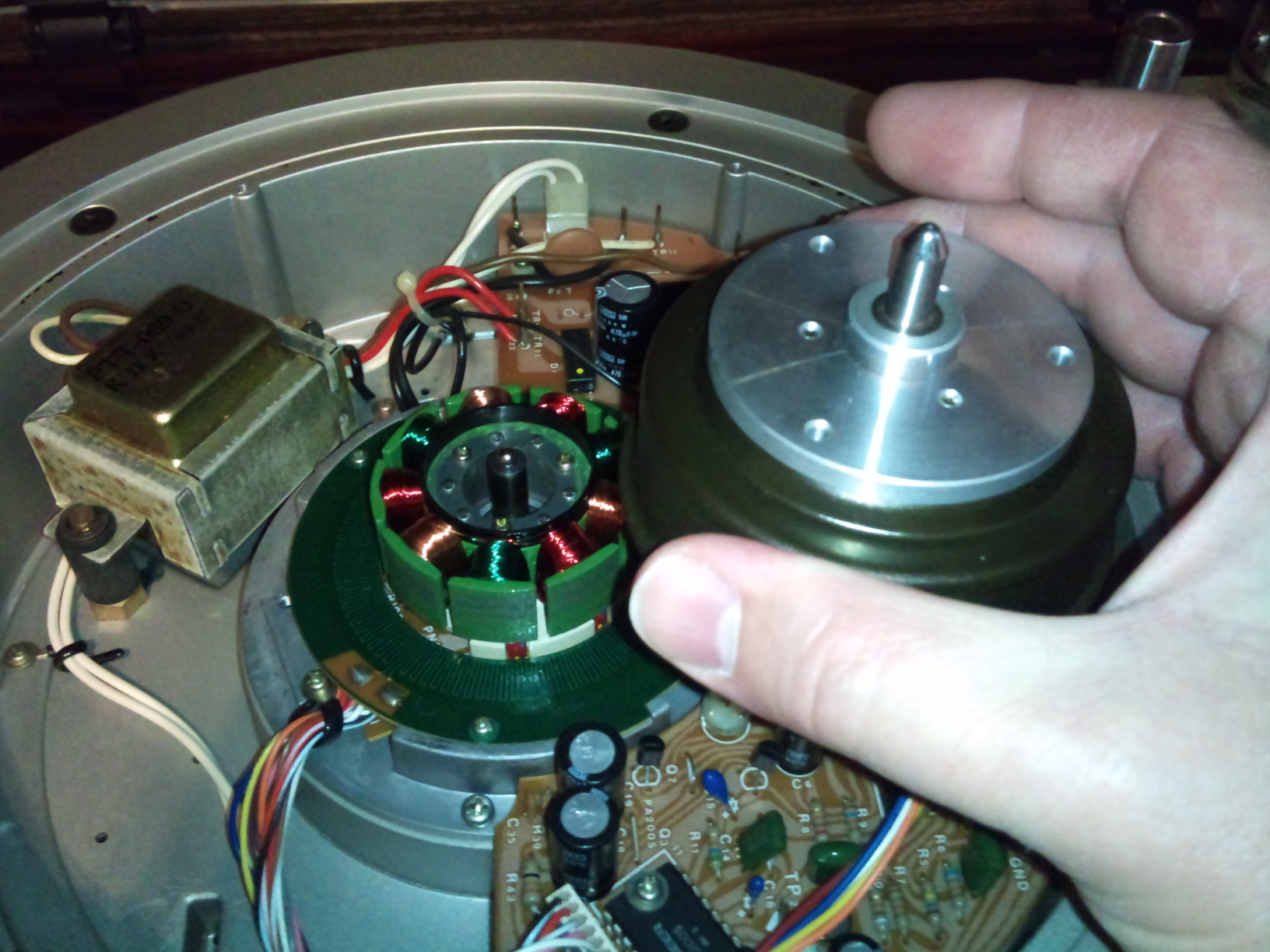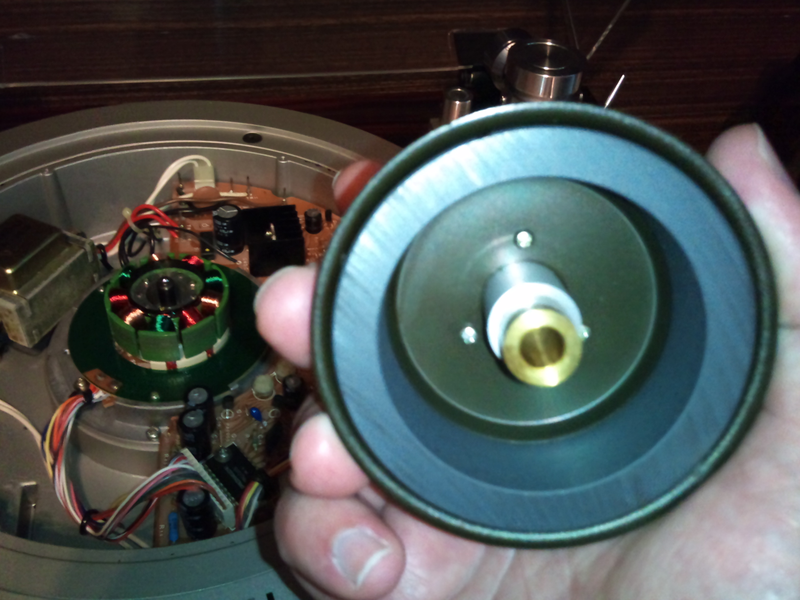 Блин! прошу прошения, был неправ. Слушал сегодня музычку и что-то закралось во мне подозрение: в перерывах между треками послышался фон, возможно из-за несмазанного вала подшипника. Решил разобрать: и о Боже, стопорный винт предохраняющий шкив от возможного соскакивания с вала невозможно было открутить. Это значит что аппарат не смазывался считай все 30 лет((. Когда наконец снял шкив или как его там обнаружил АБСОЛЮТНО СУХУЮ ВТУЛКУ и СУХОЙ ШАРИК ОПОРНОГО ПОДШИПНИКА. Фото прилагаю. Также была обнаружена небольшая выработка на белой шайбочке расположенной внутри втулки шкива. Шайбочку перевернул другой стороной, адекватной смазки не было. Взял солидол и смешал его с силиконовой смазкой , чтобы был пожиже. Не ругаться! Шарик тоже смазал, он был без выработки. Кстати, после этого кол-во оборотов диска от толкания его рукой упало с 20-25 до 10-15. Ну смазка туговата, зато надёжная. При сборке аппарата есть засада, шкив подшипника после смазки невозможно до конца опустить на втулку - не дают магниты. Собираем аппарат до конца аппарат, надеваем диск стола, включаем аппарат и только после этого шкив сядет на вал до конца. После этого закручиваем стопорный винт с предохранительной планкой . Громко музыку после этого не включал , но как показалось звук стал намного пространственнее и объёмнее. Завтра точно проверю. А забыл сказать у мну Pioneer PL-50, это важно для тех кто будет разбирать, у других моделей другое утройство подшипника.