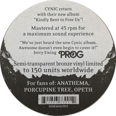 Label:Season Of Mist – SOM300LPCT Format:2 × Vinyl, LP, 45 RPM, Album, Limited Edition, Country:UK, Europe & US Released:14 Feb 2014 Genre:Rock Style: Prog Rock Тираж : Cynic Kindly bent for free us bronze LP 150 units Cynic Kindly bent for free us orange LP 200 units Cynic Kindly bent for free us clear LP 400 units First pressing on black vinyl (400 units worldwide). Послушать можно тут - шикарный трек |