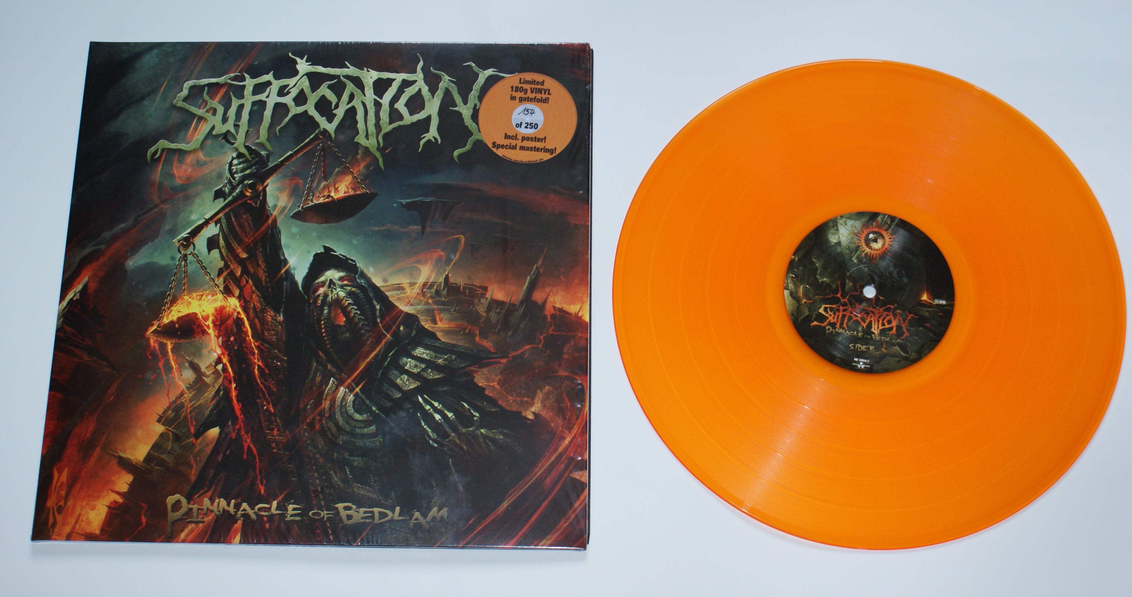 1.Suffocation-Suffocation 2006 Relapse Records RR 6584-1 2006 Limited Edition, Blue USA 2.Suffocation-Pinnacle Of Bedlam 2013 Nuclear Blast NB 3004-1 180gr.Vinyl LP Album, Clear orange vinyl limited to 250 hand-numbered copies. Gatefold cover. Comes with poster. №154,"special" vinyl mastering.Germany а у pyrexia на виниле выходила только System Of The Animal 1997 года, Переизданная Pathologically Explicit Recordings в 2012 г. сейчас восполняя пробелы заказал себе : Aborted - Goremageddon Immolation -Unholy Cult