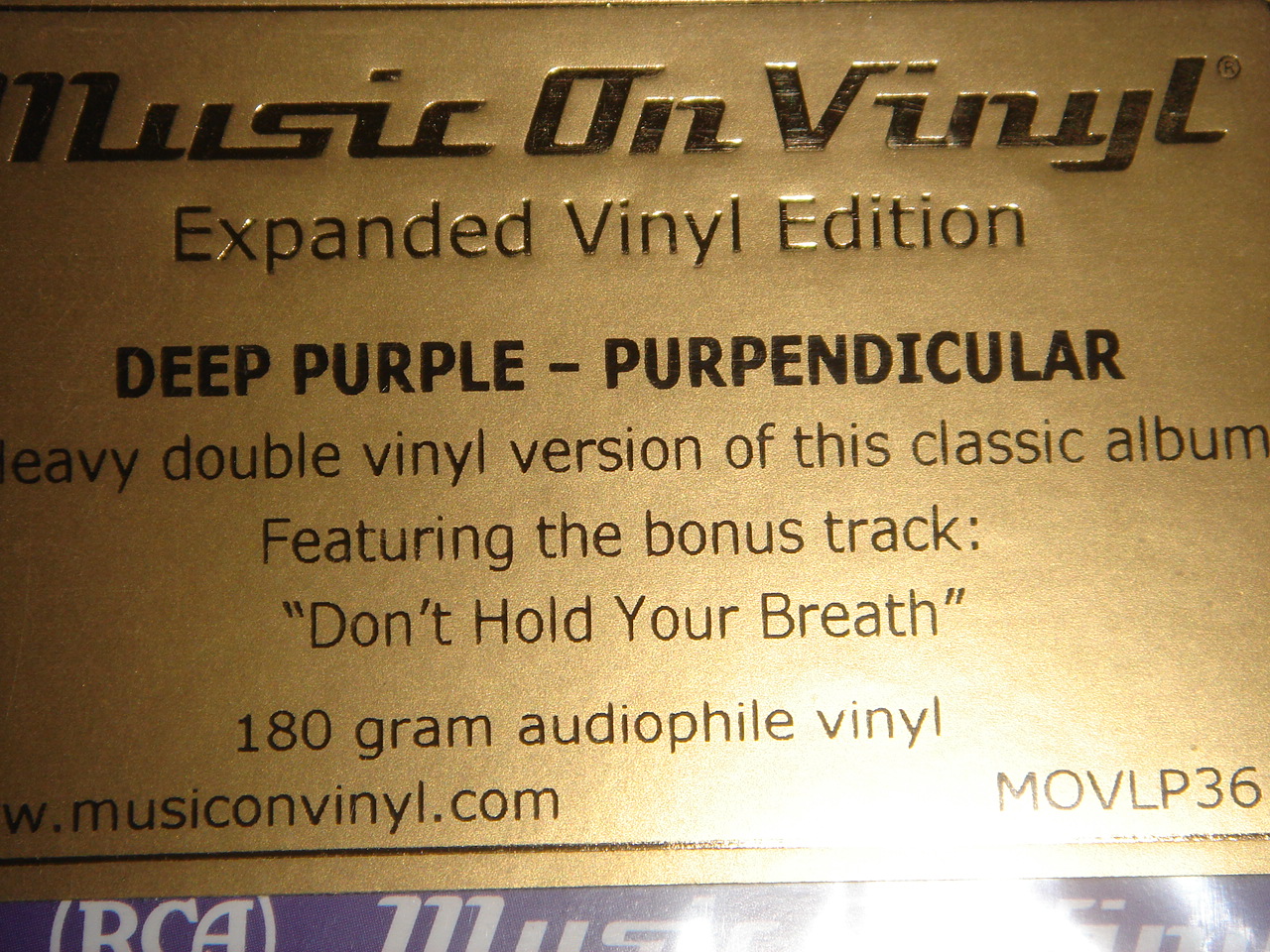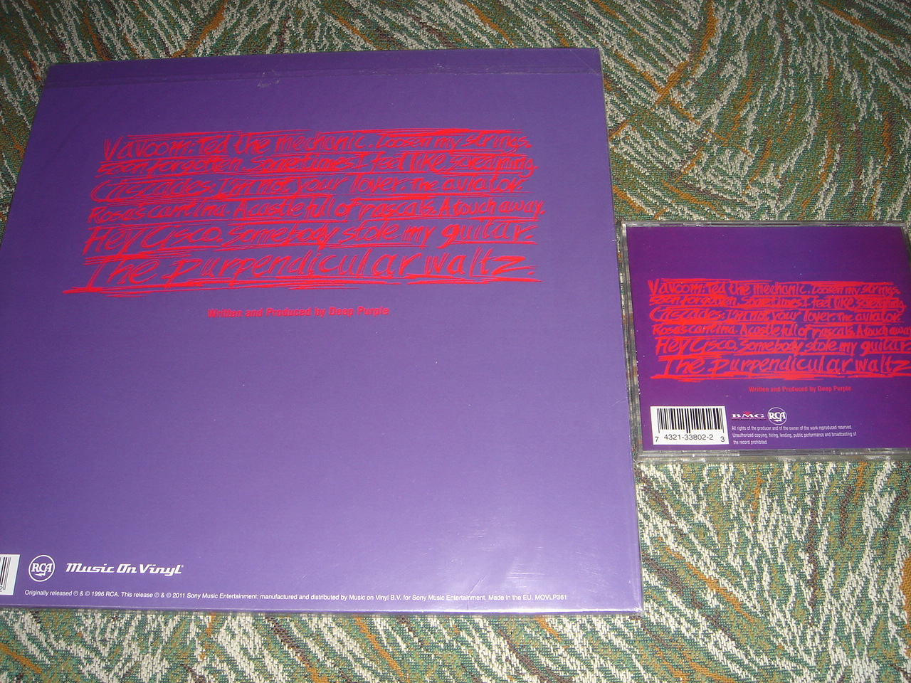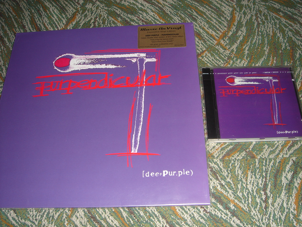 Deep Purple - Purpendicular -1996, винил издан 2011, год указан на ковере. Это тот случай, когда винил длиннее СД на бонусный трек, всё честно написано на вкладку и стикере на конверте и хотя конверт не гетефолд, два винила вкладываются в один конверт, издание отличное по звуку и изготовлению. Сам конверт, в оригинальном исполнении, без дополнительных надписей. Фирма Music On Vinyl. Что является оригиналом, в данном издании, открытый вопрос, я думаю, что СД. Винилового издания в 1996 году, кажется не было, хотя я могу ошибаться. ( можно добавить, что хотя цена изданий этой фирмы, несколько дороже чем другие, от 25-30 долларов, в "свободном" мире и до 50-60 в России, но пластинки стоят того, тем более, эта фирма не даёт копировать свою продукцию, чешскому заводу и другим коекакерам.