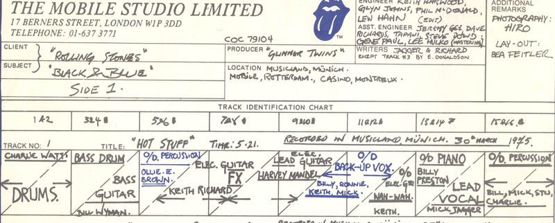 А это трек-лист с указанием того, что записано на треках широкой ленты альбома ROLLING STONES BLACK AND BLUE на студии MUSICLAND, Мюнхен, в 1975 г.:
