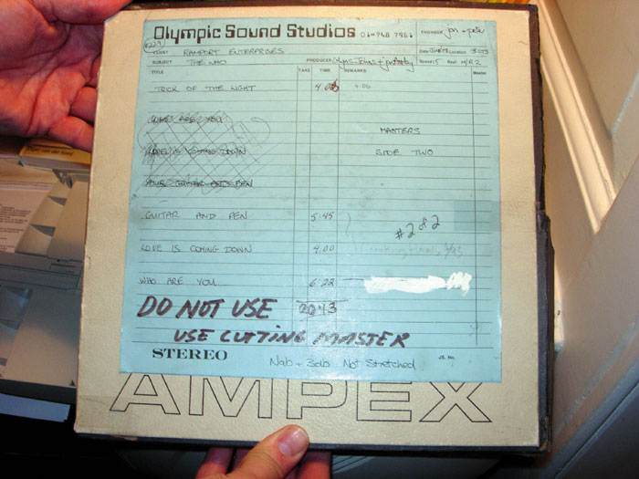 Часто на английских студиях стояли американские магнитофоны, работающие в стандарте NAB. Вот студийная узкая мастер-лента альбома WHO ARE YOU, записанная на RAMPORT STUDIOS и сведённая на OLYMPIC STUDIOS в стандарте NAB. Вот так несколько неорганизованно и сумбурно выглядят абсолютные первоисходники всего звука - узкие мастер ленты. Видите, даже пометка звукорежиссёра стоит - максимальный уровень сигнала 3dB без перетяга. Потом с них делают уже строго редактированные по паузам и фейдам производственные ленты, с которых и нарезают лакеры. Все коррекции вносятся на этом этапе. Для даббинга в 70-е использовались, например, мастеринговые магнитофоны типа STUDER A-70 и им подобные. На них имелась возможность переключения стандарта NAB/IEC, также, как и на многодорожечных магнитофонах STUDER A-80 и более поздних серий. Если высылался стампер, то ему всё равно, какой стандарт, ибо он уже в механическом формате. Вероятней всего, стандарт не имел существенной разницы и на более ранних магнитофонах, его, скорее всего, учитывали обязательно. Ищите разгадку в коррекциях при изготовлении собственного лакового диска.
