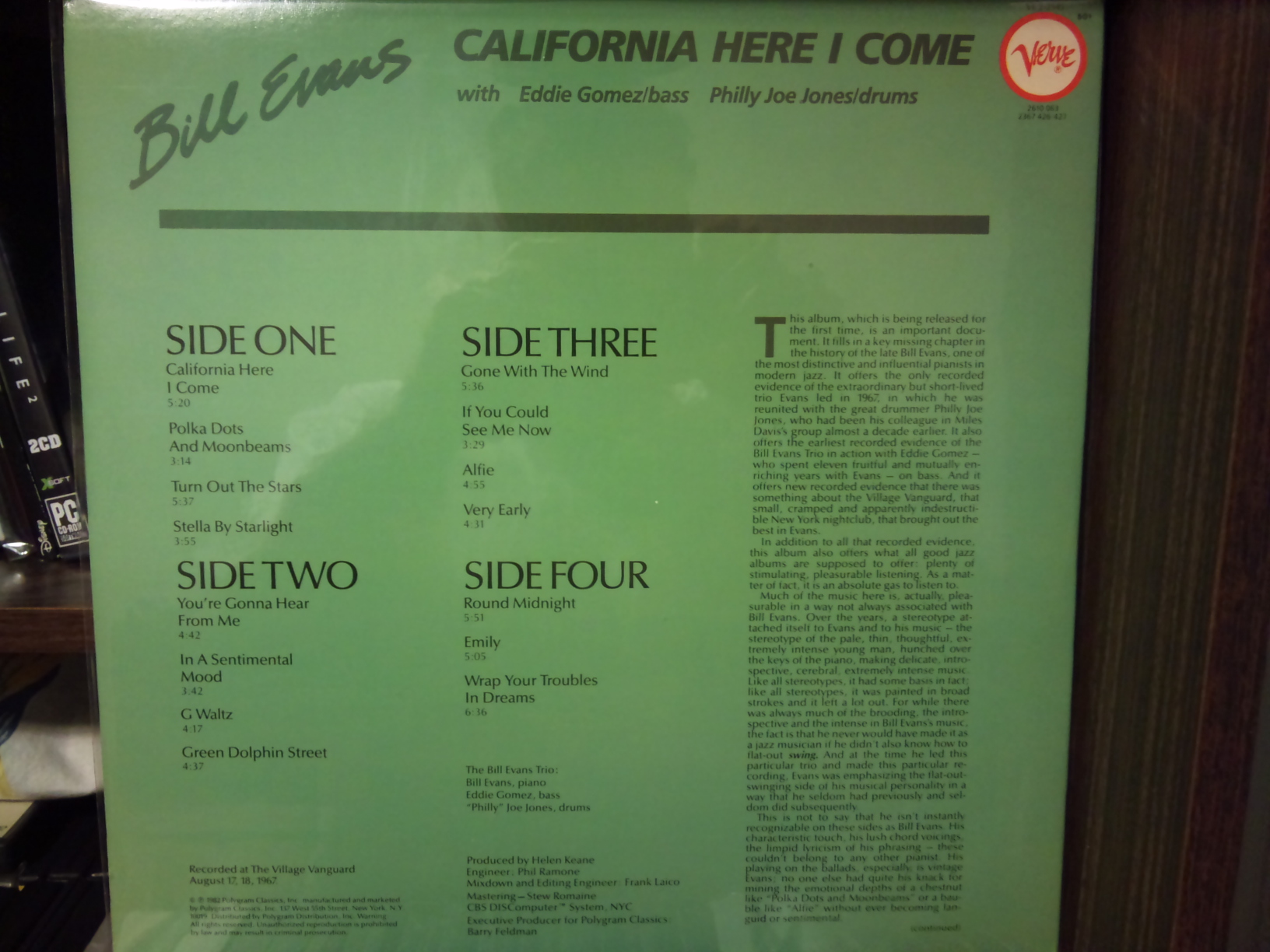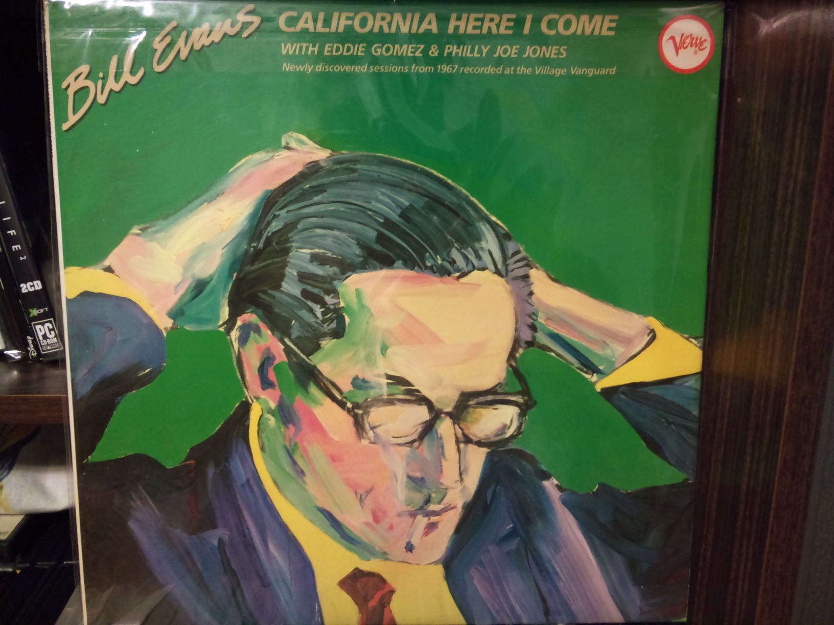 Итак, получил вчерась джазового пианиста Билла Эванса. Пластинка Минтовая. Запись 1967, 2LP, в ночном клубе Village Vangard. Запись якобы потерялась и была найдена в начале 80-х и издана в 82-м году. Verve Records. Записано душевно. Чел полтора часа лАбает на рояле в сопровождении контрабасиста и ударника. Под коньячок и задушевные разговоры самое то. Правда немножко заумно, но в целом очень достойно. Типичная для 60-х запись с приглушенными высокими частотами.