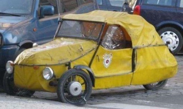 это скорее моя... называется это чудо Vertex, мотор от моцика Ява и тручбатая рама обтянутая брезентом.... стояло оно возле Танцующего дома на набережной Влтавы... по городу переодически энтузиасты передвигаются на этом....
