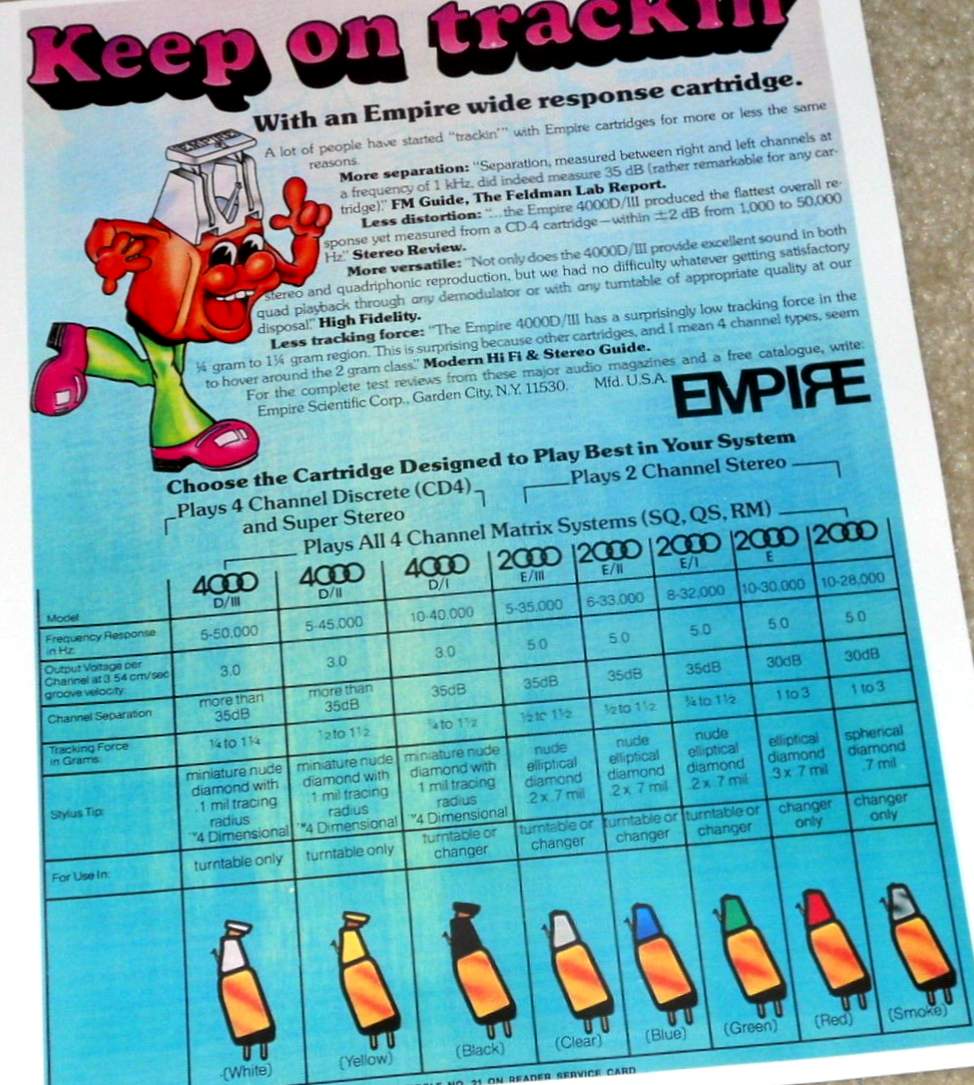 Проблема- правильно выставить антискейт. У тонарма для выставления антискейта есть вешки - красная и зелёная, сфера и элипс. Искал к чему отностися Empire 4000 D/I, так и не нашёл. Прижим 1,1. Изночально всё было настроено специалистом, но желание по слуху всё настроить всё испортило, а По тестовой пластинке идеально антискейт настроен (перестаёт пищать)когда ручка вывернута полностью до упора,и необходимо увеличить прижим почти до 2.