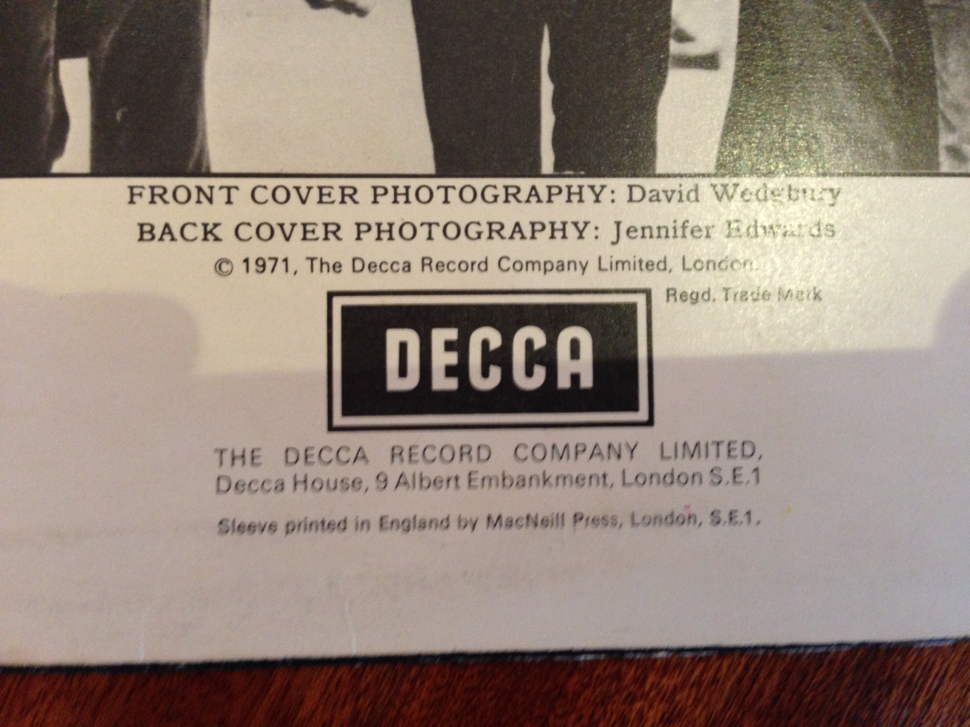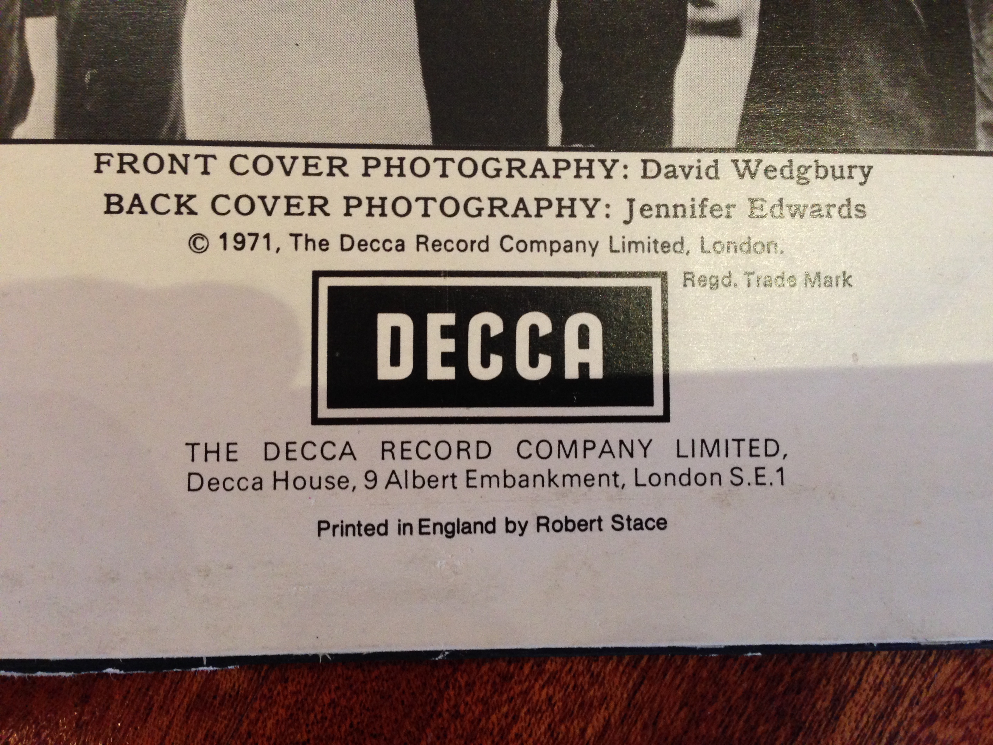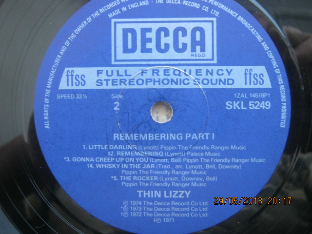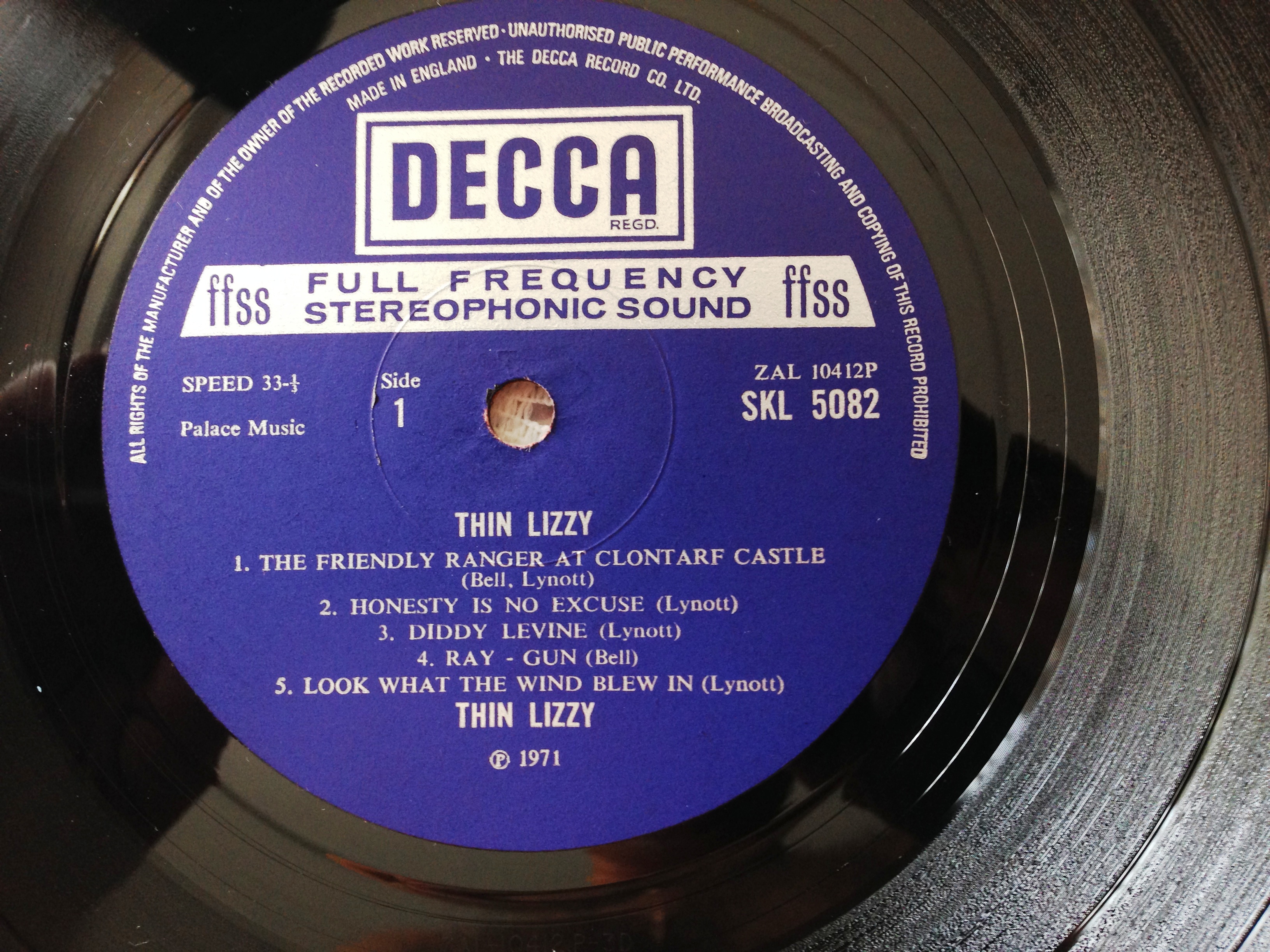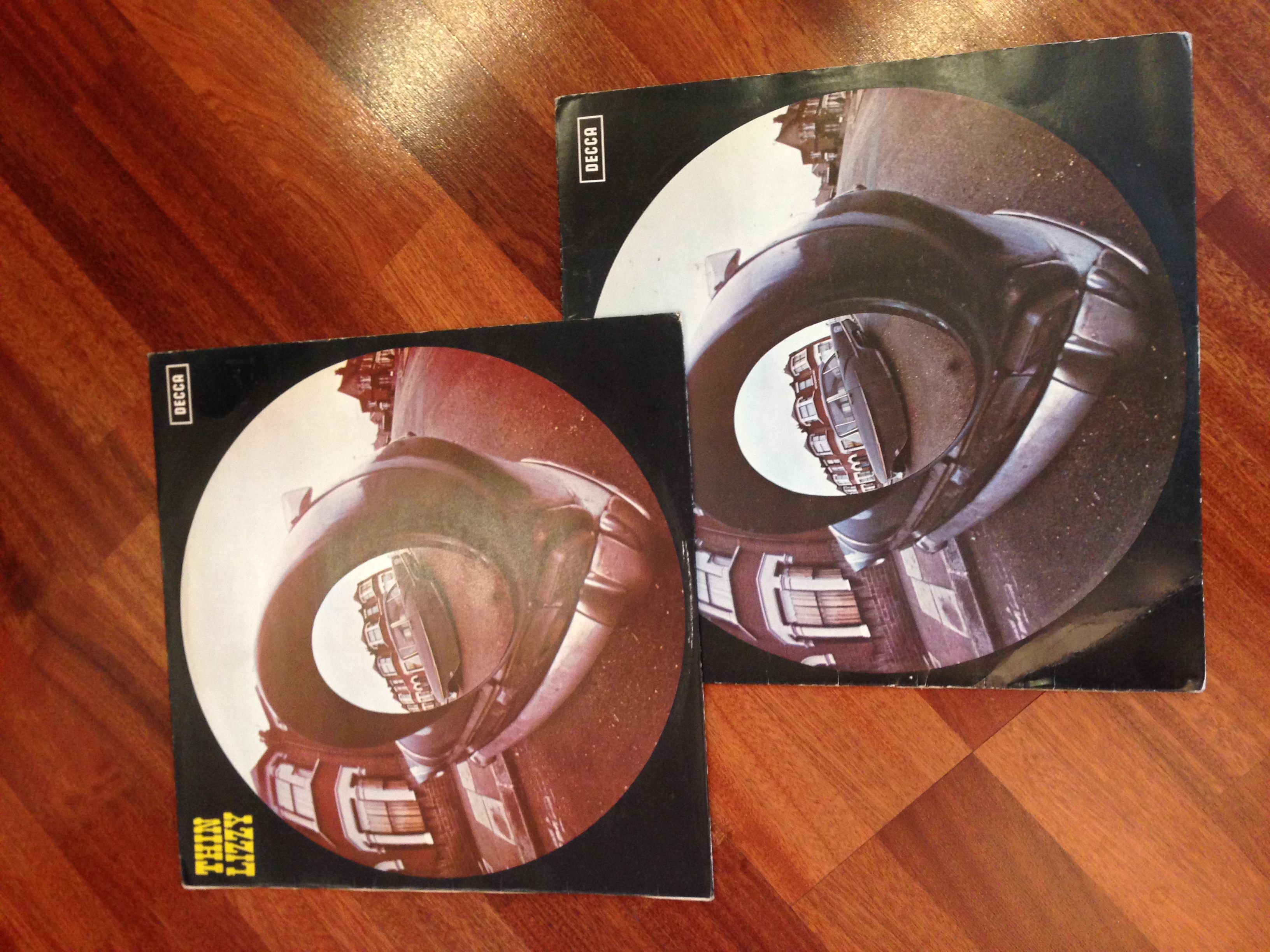 Есть два экземпляра первого альбома Thin Lizzy. Оба приехали из Англии. Сами пластинки полностью идентичные. Разные конверты. Отличаются оттенками переднего фото (одно коричневатое всё) и надписями ссзади внизу. У одного: "Printed by McNeill press", у второго "Printed in England by Robert Stace".