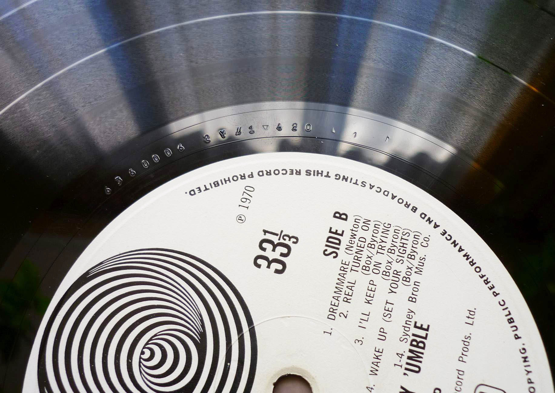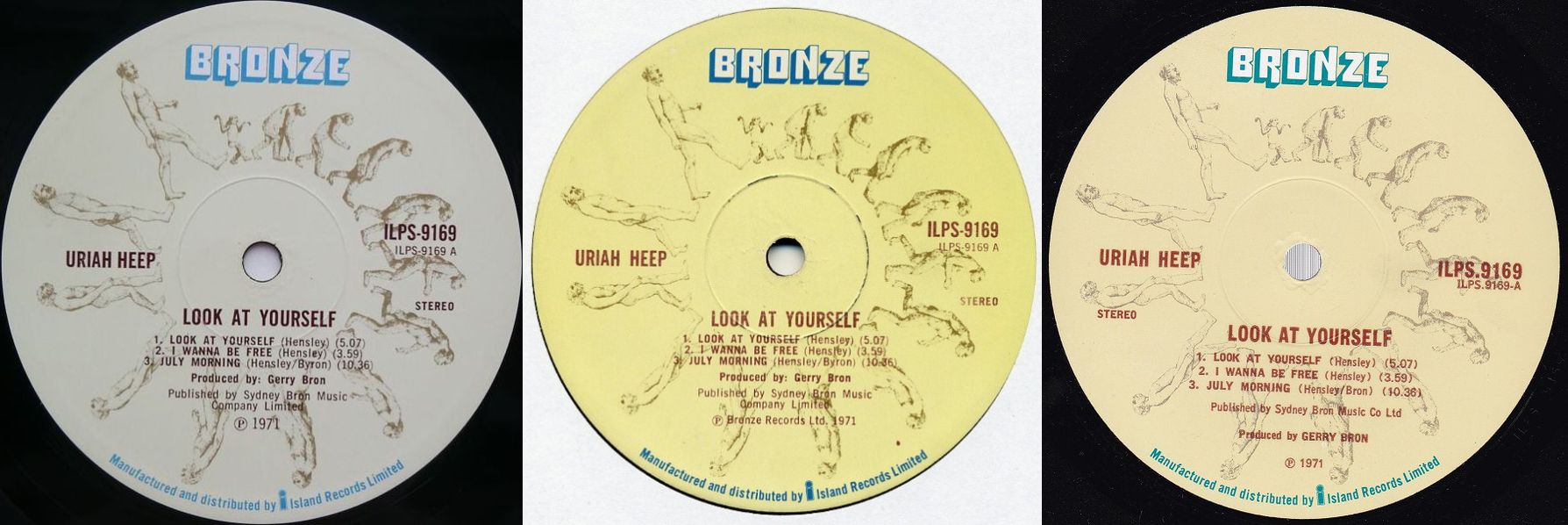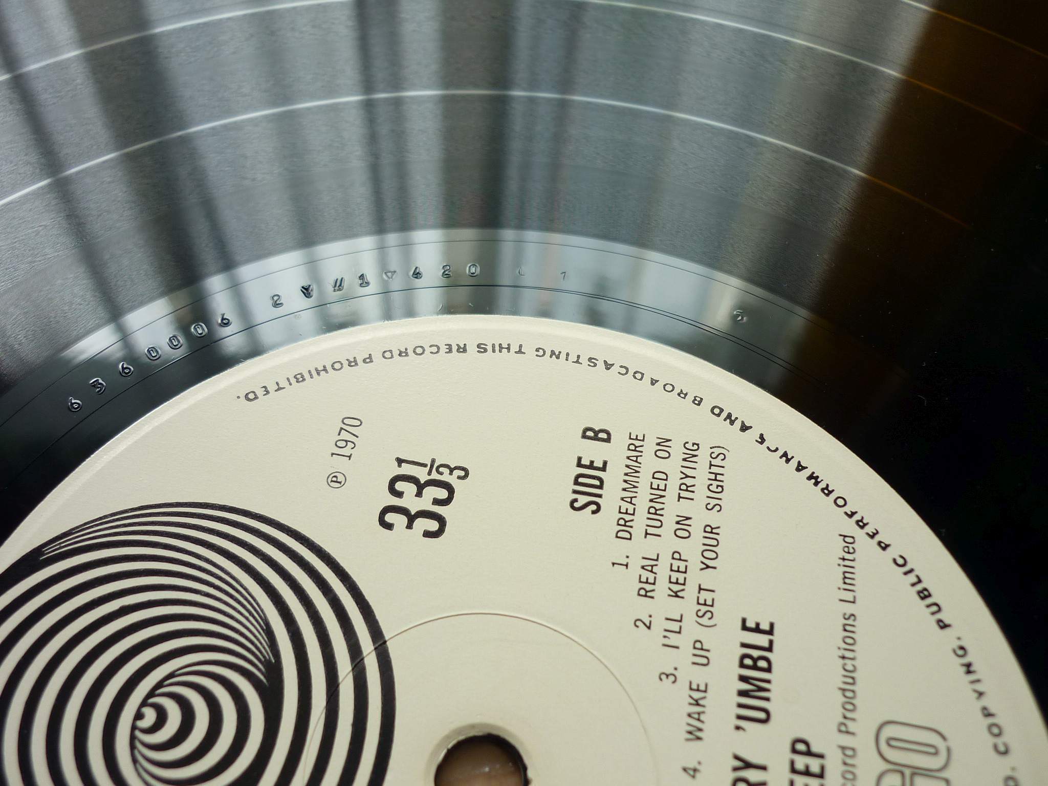 Вот ещё пример двух изданий первого альбома. Первый пресс без кредитов на лейбле, второй с кредитами. Здесь разобраться ещё сложней. Матрицы у них одинаковые, а вот стемпера более ранние у второго издания. Первый пресс L1 4/L1 5 а второй пресс L1 1/L1 1. Разница по времени у этих изданий могла быть в несколько недель, а в те годы строгой системы по стемперам не было. И скорее всего первый пресс отпечатали со стемперов из середины тиража. |