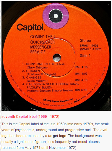 1949-1954: пурпурный лейбл, серебристый принт. Существуют варианты с красным лейблом и золотистым принтом 1954-1958: моно альбомы - голубоватый лейбл с серебристым ободком (как правило). Существует также серый лейбл 1958-1959: моно и стерео, номера примерно с 1021 до 1225. Черный лейбл, радужный ободок, белый логотип и надпись слева "Long Playing High Fidelity" 1959-1962: номера примерно с 1226 до 1660. То же, что и предыдущий вариант, но на лейбле есть белая вертикальная линия вместо "Long Playing High Fidelity" 1962-1968: номера примерно с 1660 до 2999. Логотип "переехал" в верхнюю часть лейбла 1968-1969: появляется надпись "A subsidary of Capitol Industries, inc." 1969-1971: зеленый лейбл, надпись Capitol в левой верхней части, логотип "мишень" вверху 1971-1972: красный лейбл, надпись Capitol в левой верхней части, логотип "мишень" вверху 1972-1978 (середина): оранжевый лейбл 1978-1983: матовый пурпурный лейбл, большая надпись Capitol