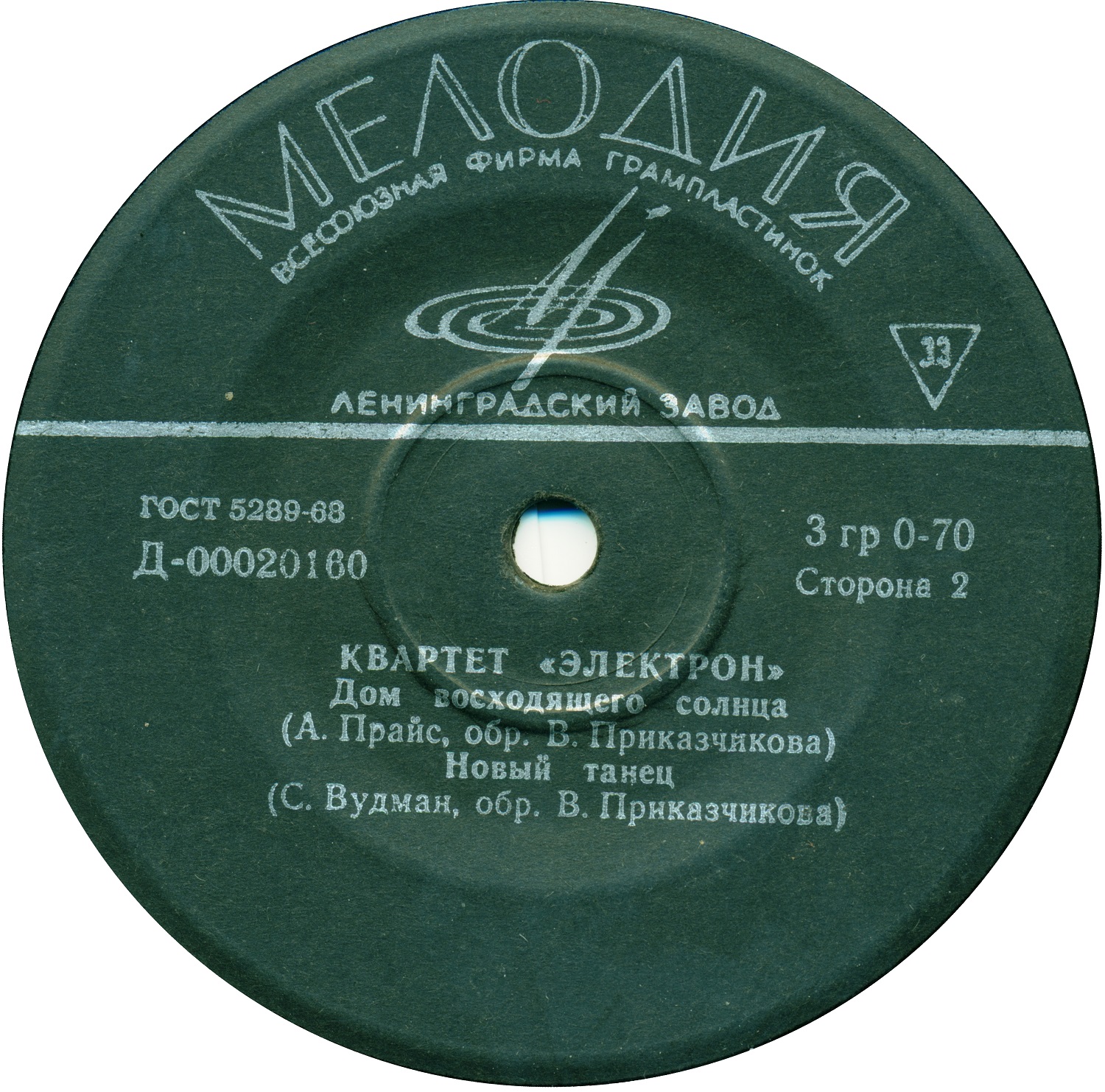 * 1967 * QUARTET "ELECTRON": V. Prikazchikov Мелодия из к/ф "Шербурские зонтики" (Soundtrack"Umbrellas of Cherbourg" ) M. Legrand Посмотри(Look) D. Rossi Дом восходящего солнца (House of the Rising Sun) A. Price Новый танец( New Dance) C. Woodman House of the Rising Sun Я услышал первый раз на этой пластинке, потом была "Эстрадная Орбита" в исполнении на диске Мелодии C60-05007 и только потом в исполнении The Animals и Geordie. |
