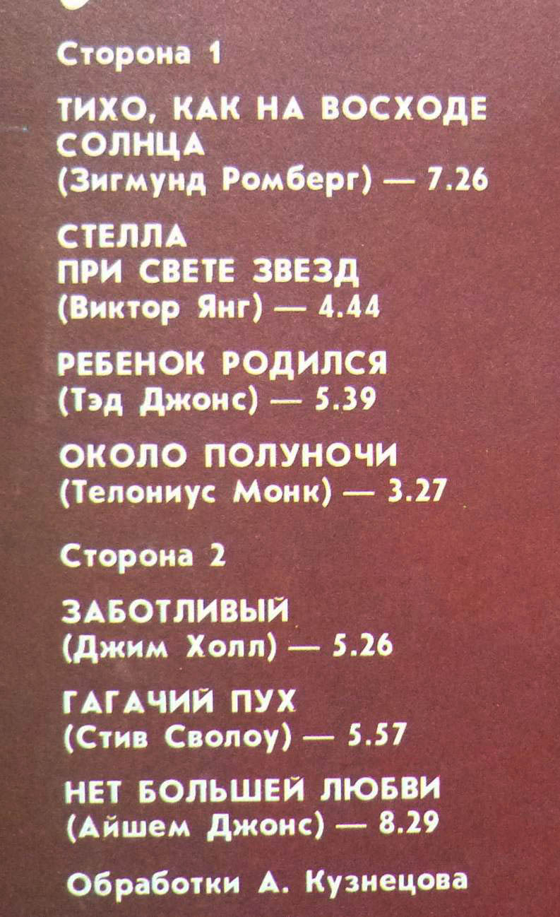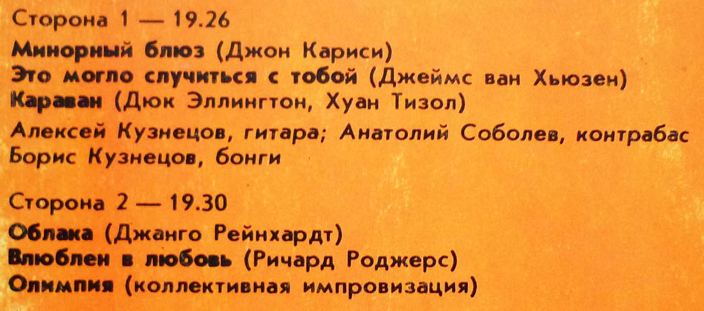 Меня смущает немного другое. Вроде бы и гитарист отличный, и материал неплохой. Но из всего альбома только одна композиция автора (кстати, совсем неплохая). Буржуйские инструменталисты в то время выпускали массу альбомов, преимущественно со своим материалом. Наши же со скрипом выпускали по паре пластинок, да и те в основном с обработками других композиторов.