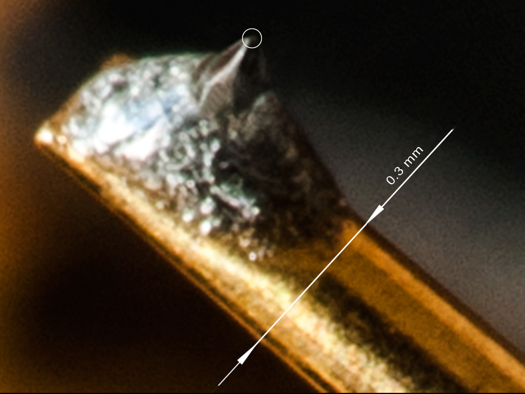 Я о том, что все эти фото под разным углом сделаны, и разными объективами (разное фокусное расстояние объективов). Кантеливр ведь не плоская пластинина с одинаковыми размерами, а где то в диаметре круглый, где то - овал и т.п. - То, ка ты проводишь просто перпендикулярную линию в отношении к плоскости, а тем более, в отношении к игле с сложной (многогранной) заточки... - это не корректно по многим параметрам...