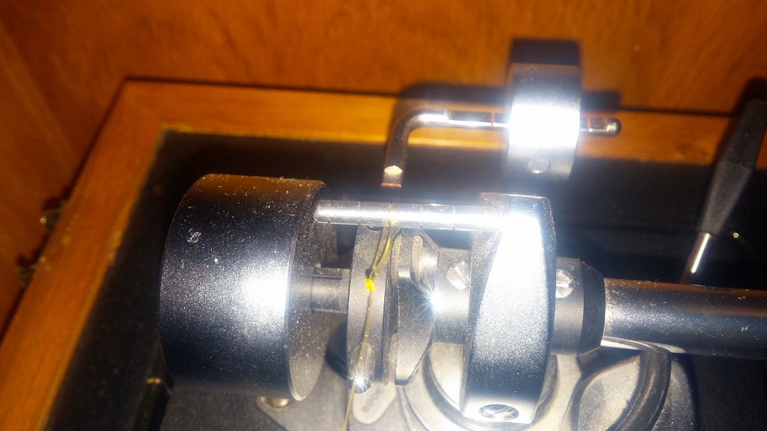 Это крутилка, которой тонарм устанавливается в нулевое положение. Давление на иголку выставляется маленьким грузиком справа.