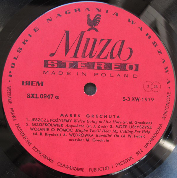 Марек Грехута - Дорога за горизонт, 72 год. По моему, потрясный диск для любителей "интеллектуальной" музыки. Затрудняюсь сказать на кого он похож тем, кто его не слышал. Он скорее говорит, чем поёт под классную аранжировку. Как правило, слушается даже теми, кто признаёт только запад. И удивительная для Музы запись, практически все частоты на месте, плюс прозрачность. Почти как на Коламбии. Лучшая по записи польская пластинка, которая мне не попадалась, а слушал их много (до середины 80-х). А вот на дискогсе он не ценится. Так, порядка 10 евриков. А какой-то проговый одноальбомный Nurt стоит порядка 150??? Хотя, на мой взгляд, ерунда полная (был раньше, с польской выставки). Конечно, этот Nurt очень редкий, но, кому он нужен ....