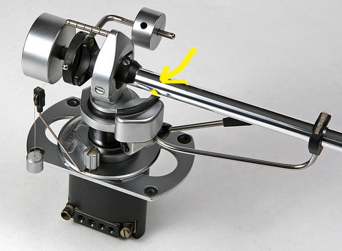 С этой скобой тоже непонятно: судя по снимкам, на некоторых модификациях этого тонарма она является частью базы, по которой ходит тонарм во время движения по пластинке. На моем она является частью тонарма, а на самой базе есть круглая черная деталь, по которой скользит эта серповидная скоба.
