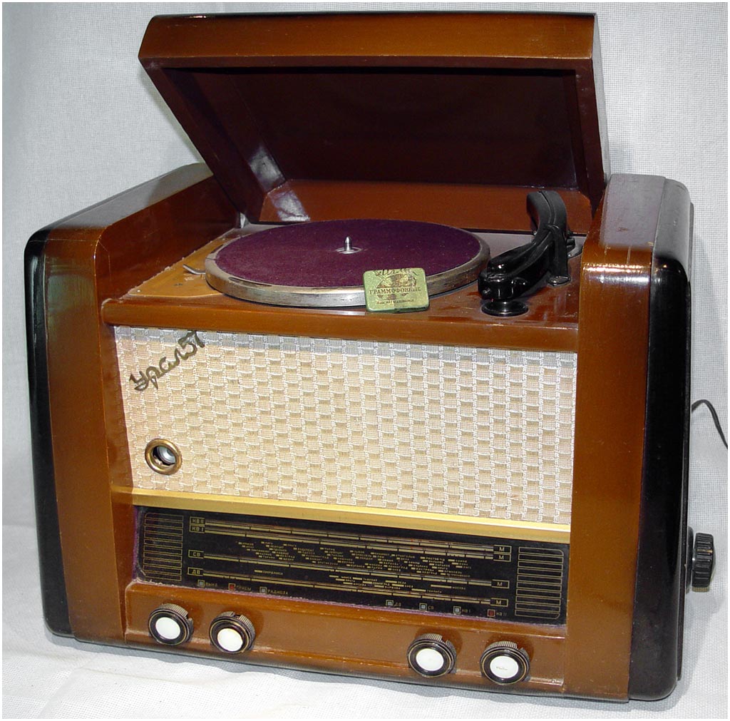 Абсолютно не вяжется . Урал -57 был полноценной радиолой , а никак не патефон . . . Патефон выдавал звук через мембрану , расположенную на тонарме ( в том же корпусе , что и игла ) ...Насчет патефона - недели 2 назад в гостях у друга - послушал настоящий патефон .... Что сказать - радио-точка на кухне - это аппарат хай-фай по сравнению со звучанием патефона....