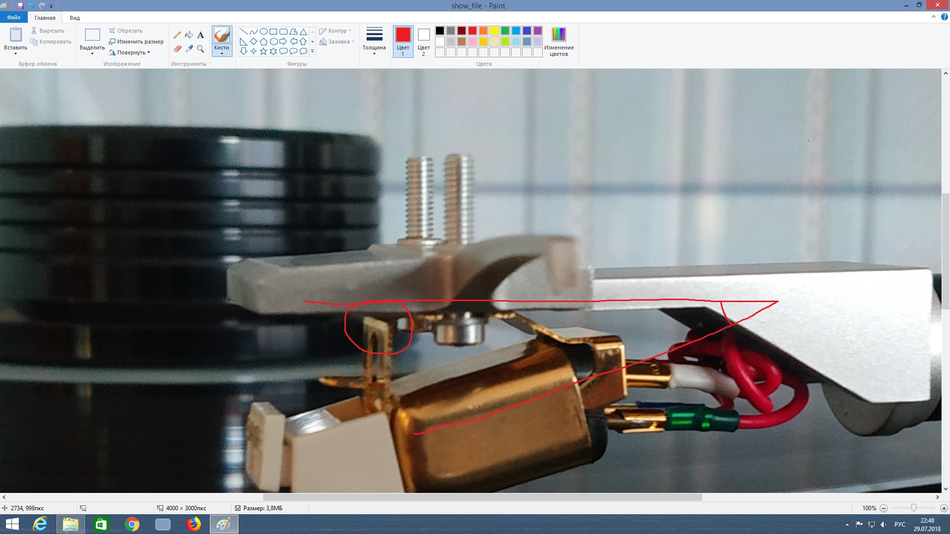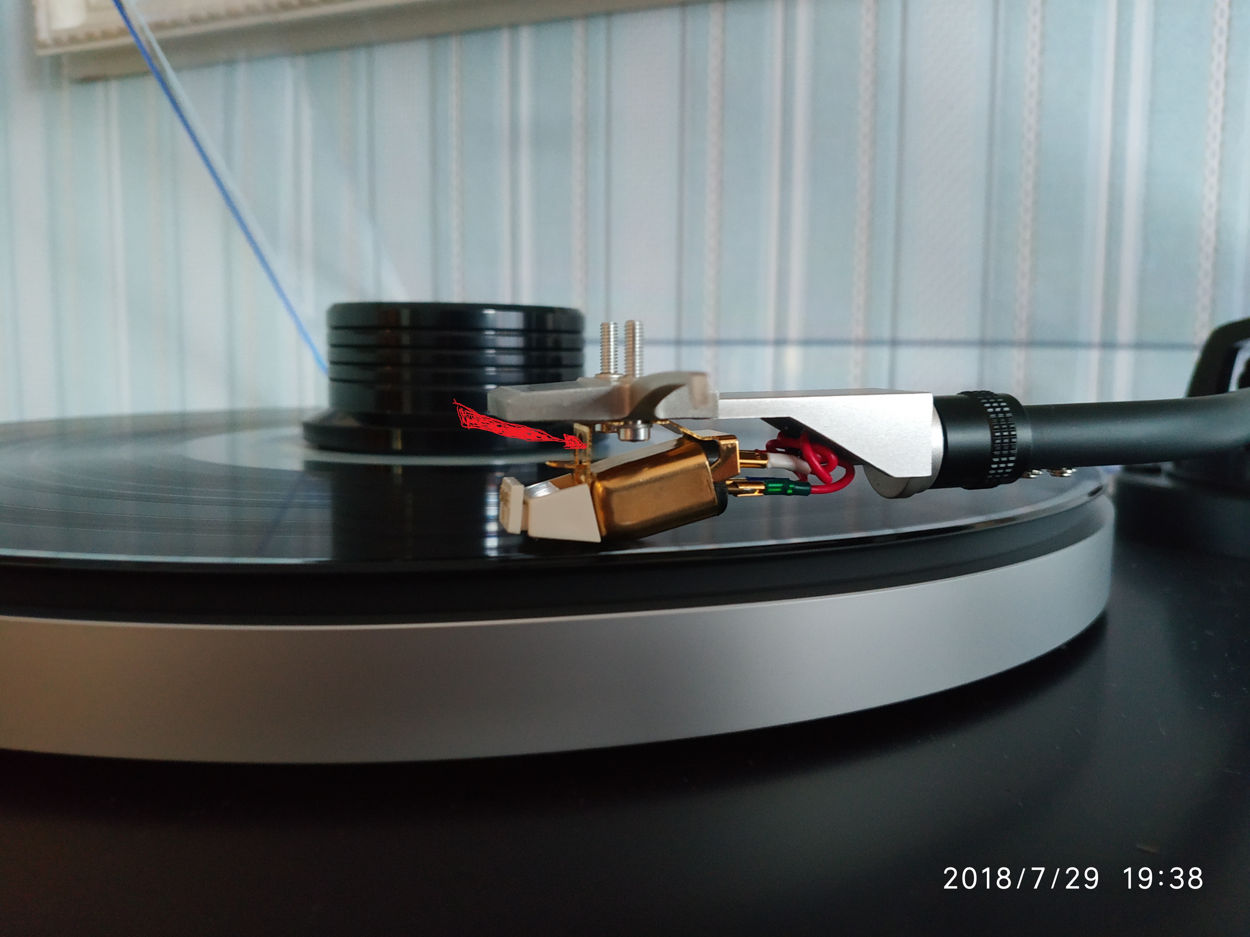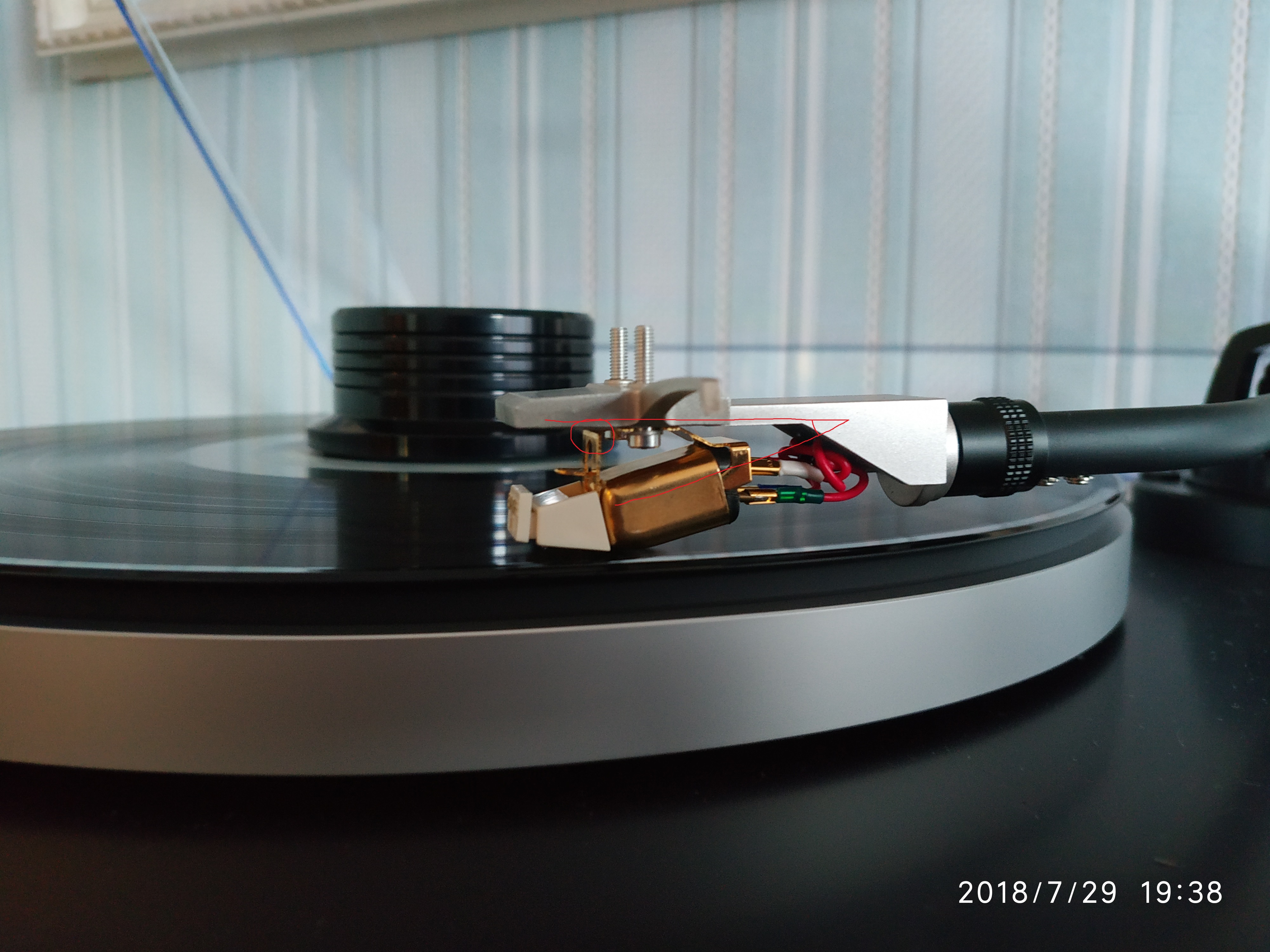 Не знаю как объяснить.... Тонарм как бы наклонен.