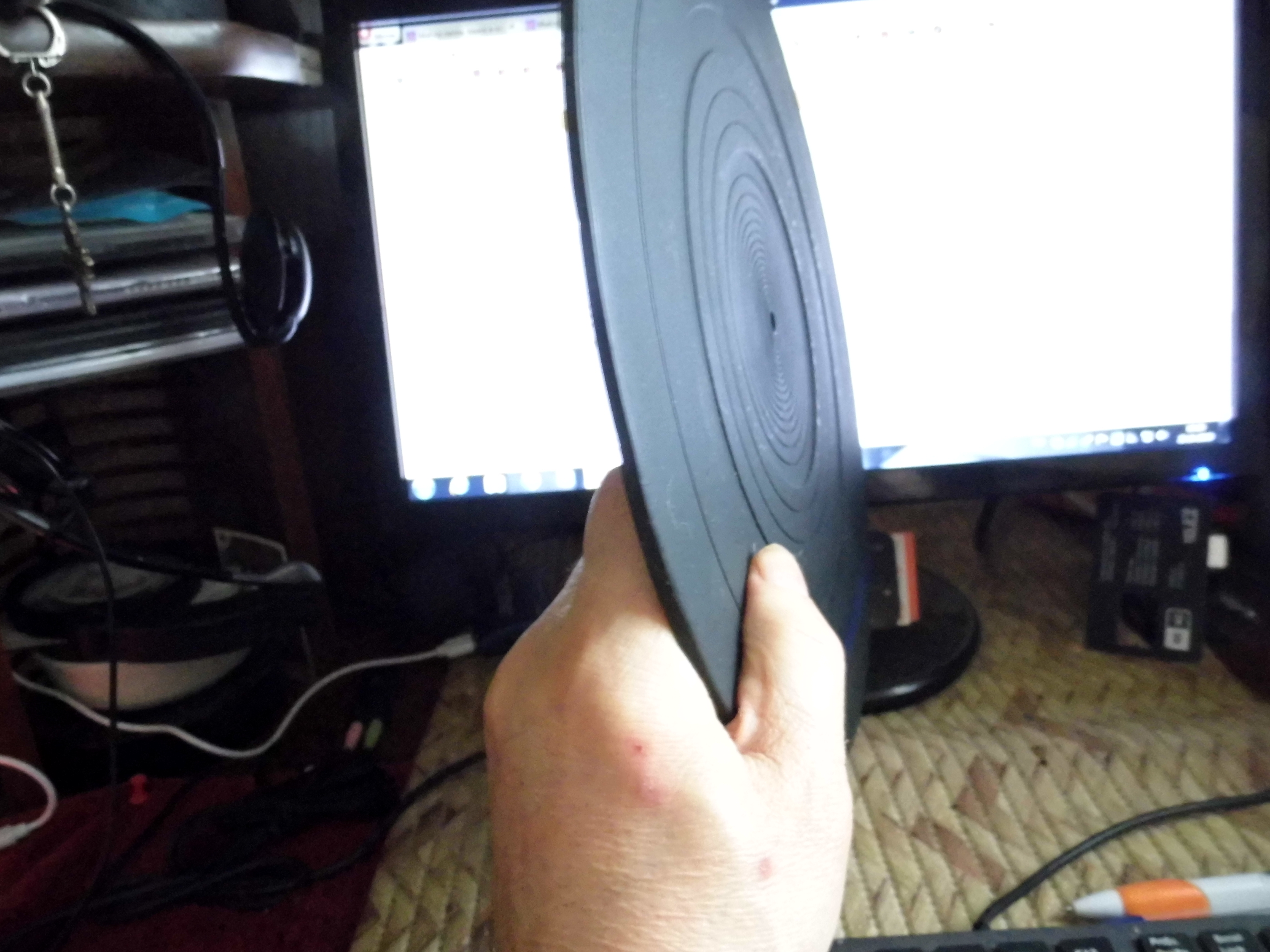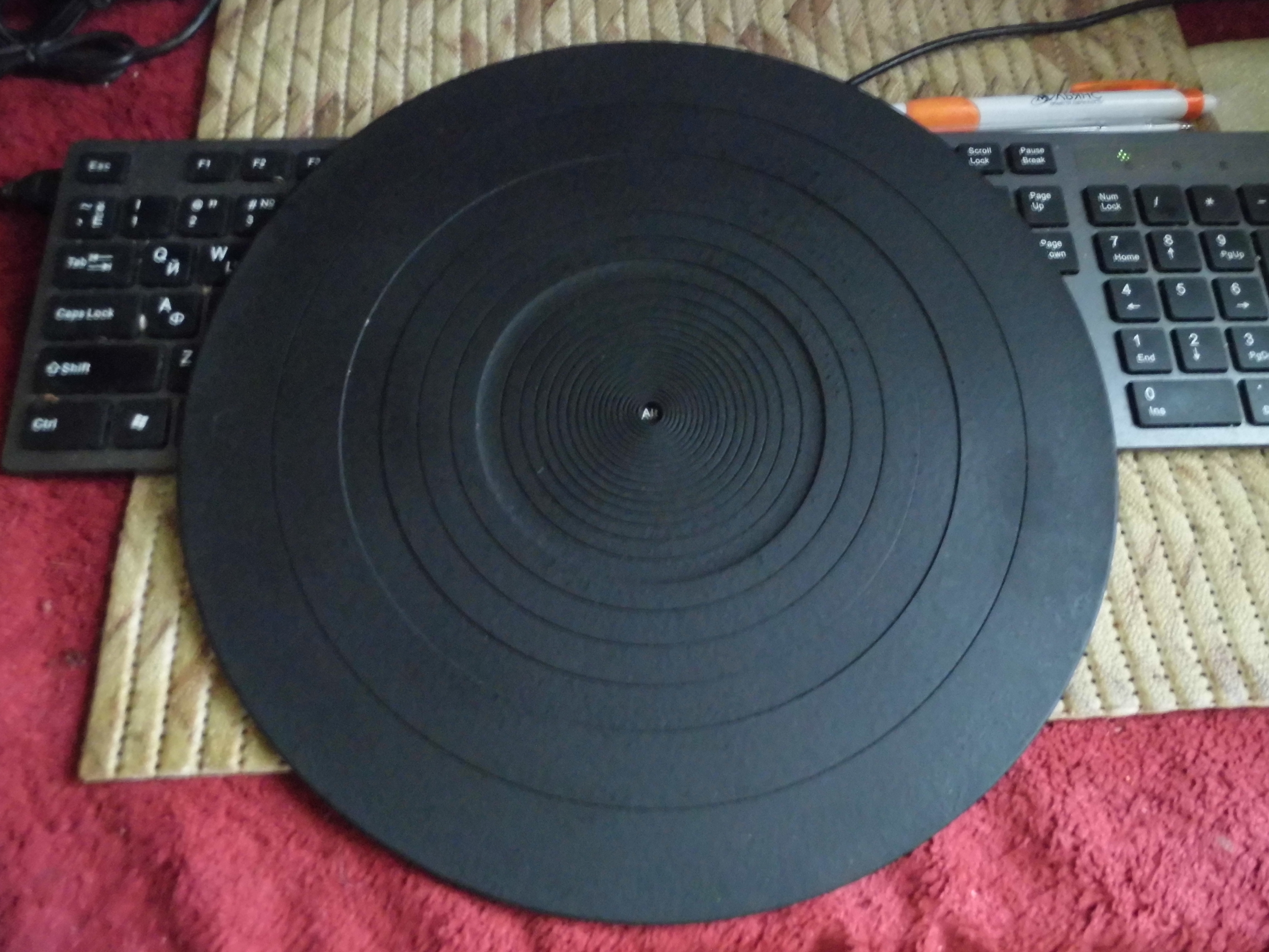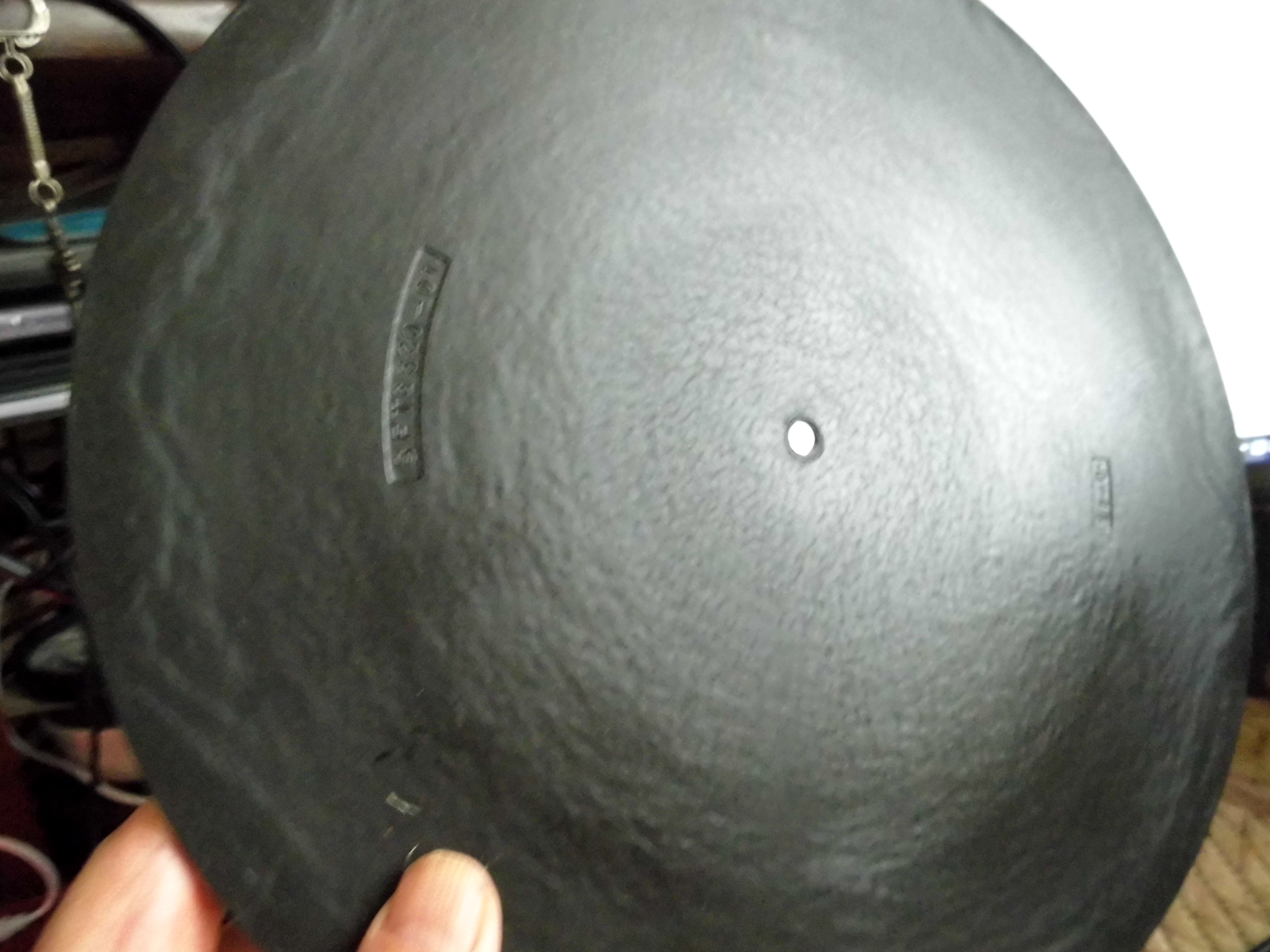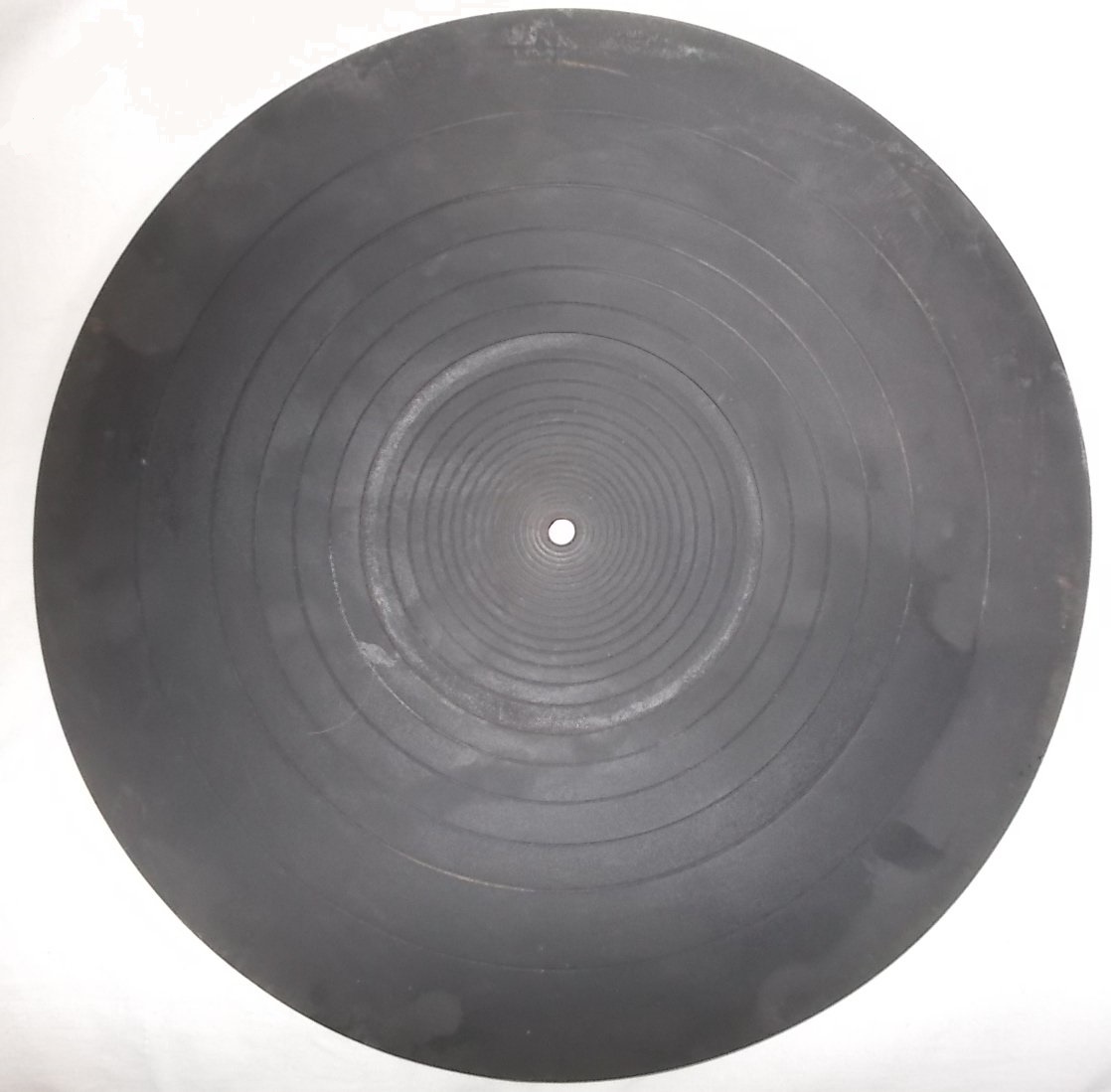 Искал я как то толстый 6мм мат от Technics. Поглядел на цены, от 1400 до 3200р. Думаю, да ну его на хрен. И через несколько дней, совершенно случайно у одного продавца ручек от комодов и прочей ерунды, вижу "подкладка под пластинку - 50руб" и фото. Я вижу то, что я ищу. Вид правда такой, что это была скорее подставка под сковородку. Рискнул, купил. Отмыл керосином, стала вполне приличной на вид.
