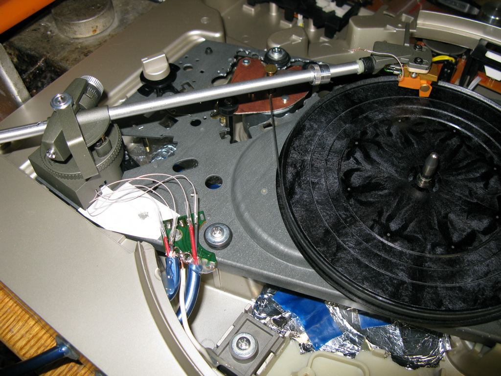 На третьей фотографии видно заземление головки звукоснимателя. Припаял провод к земле головки, второй конец посадил на точку земли тонарма.