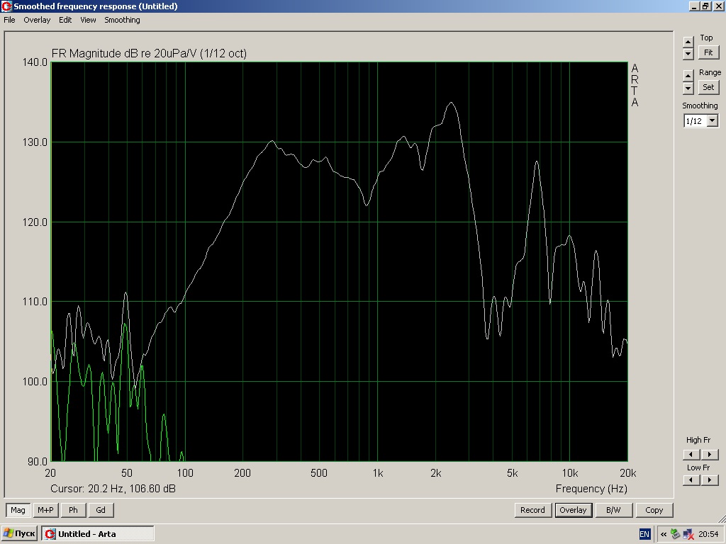 Вот АЧХ СЧ драйвера, мерил на скорую руку (Бокс 1,2 литра, мощность 5 Вт, расстояние 0,5 м), понял что это не Hi-Fi и вернул хозяевам со "словами это не лечится".