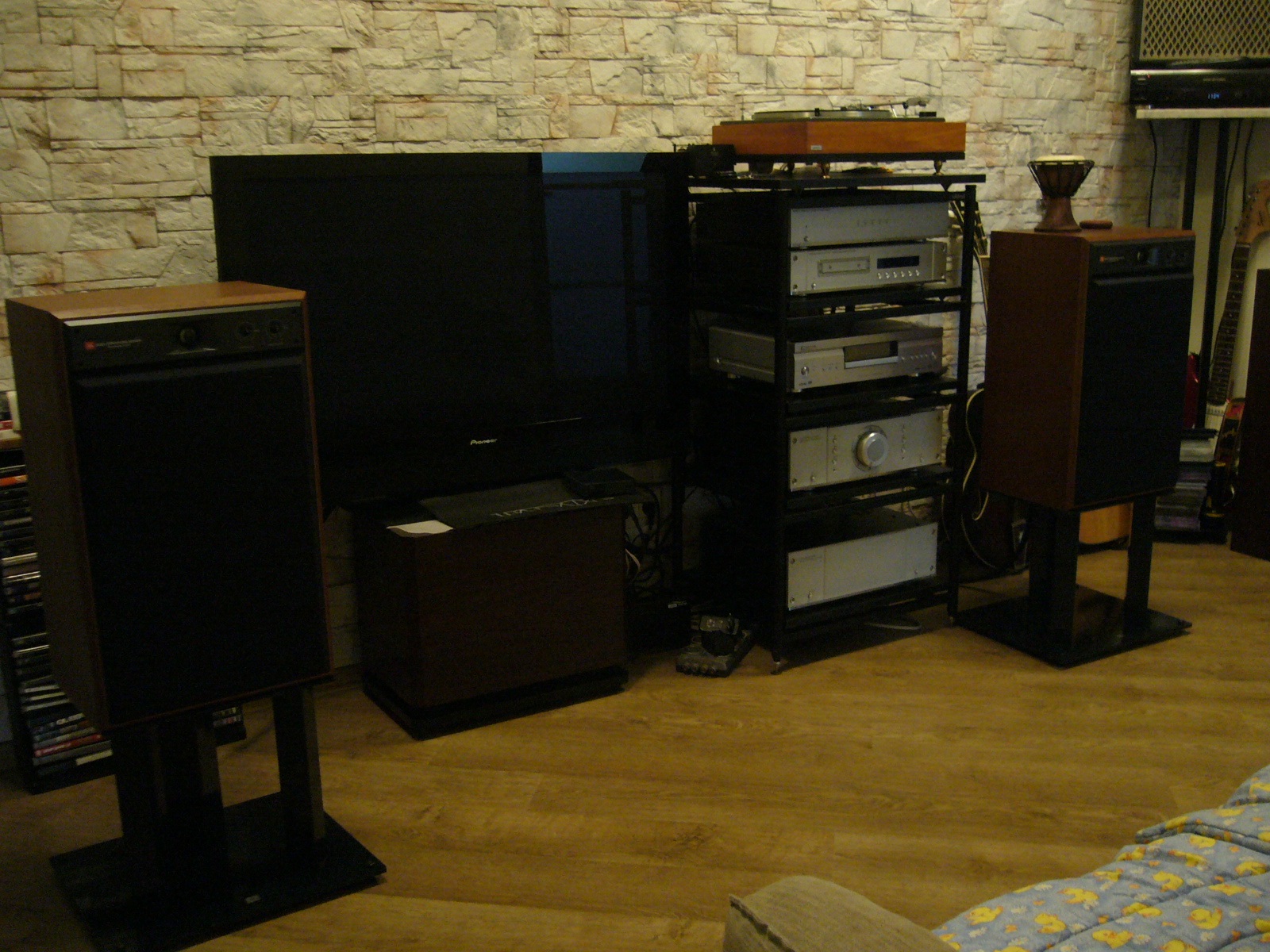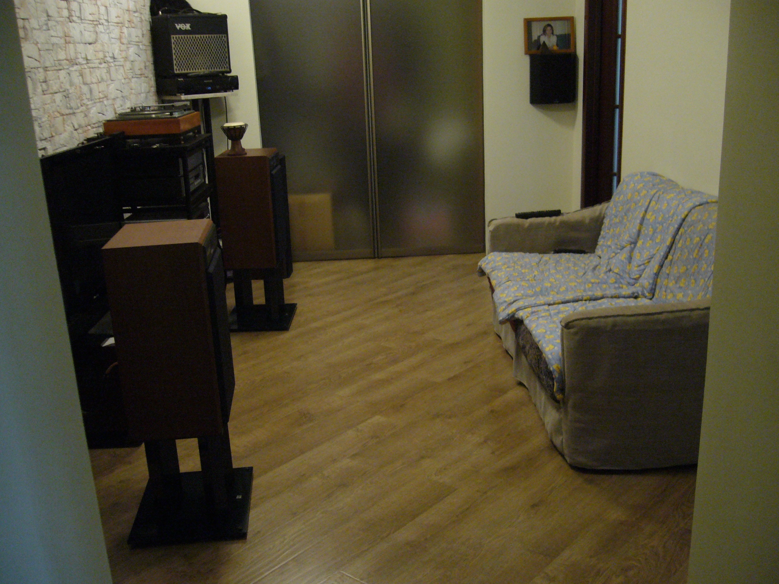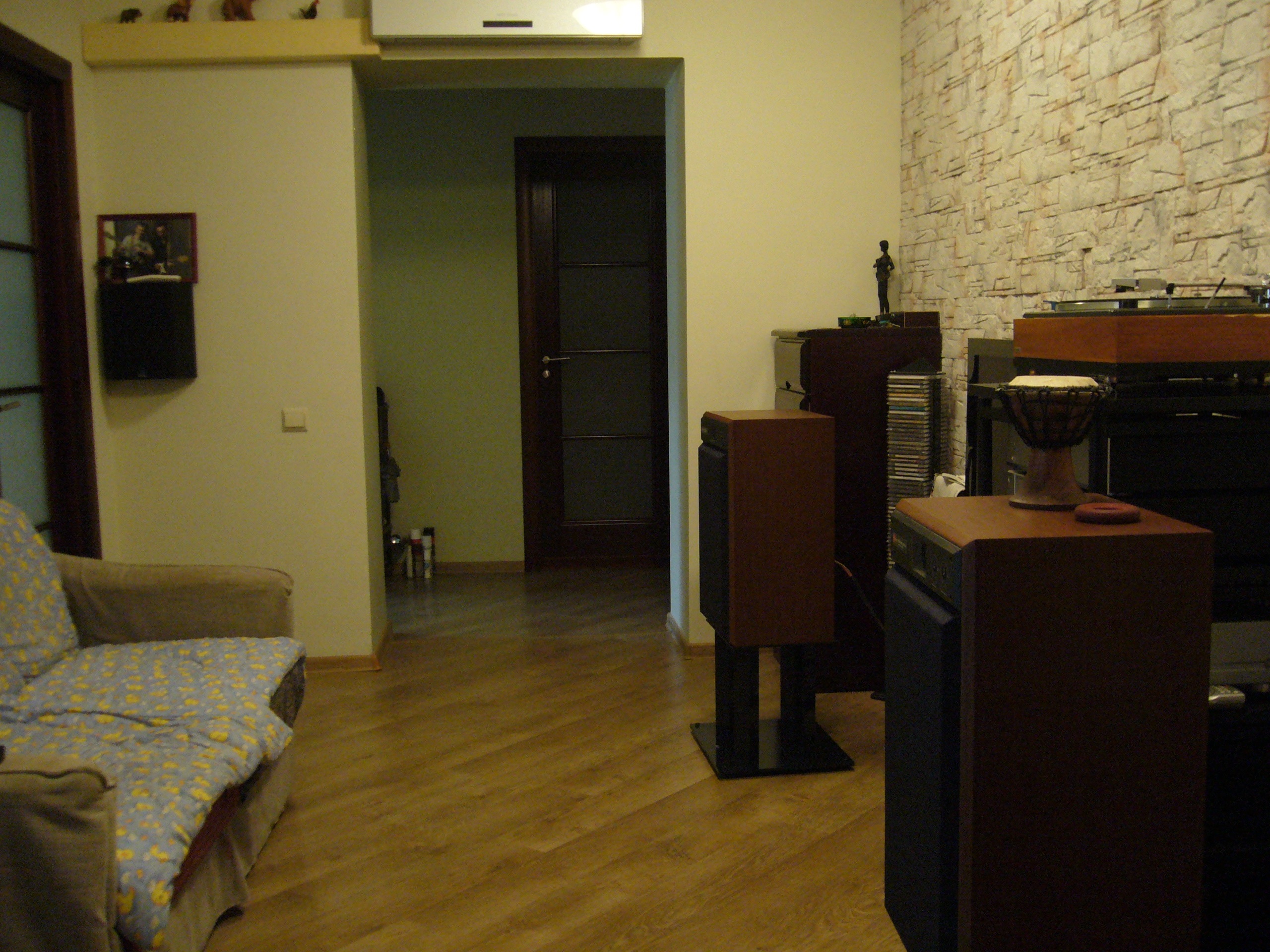Спасибо. Ещё от остатков ДК надо избавиться. Там, где ненужный саб сейчас временно стоит под плазмой, планируем портал с камином поставить. Стойку хочу вынести вправо за пределы стереозоны, но розеточная группа обеих выделенок в аккурат находится за сабом и сетевики компонентов не дотянутся до неё тогда, так-же, как и акустический провод до дальней колонки не достанет - всё придётся покупать и причём сразу