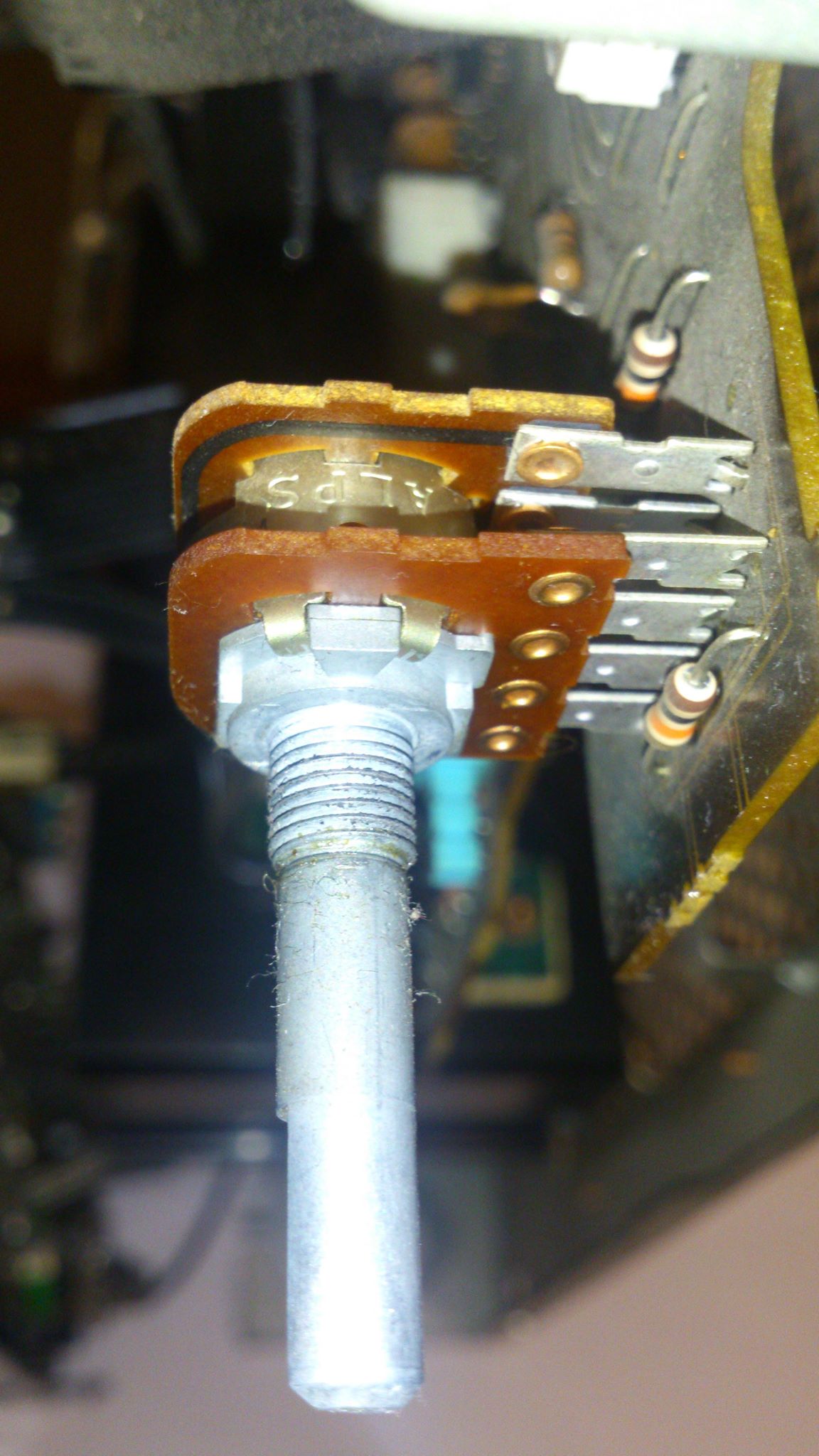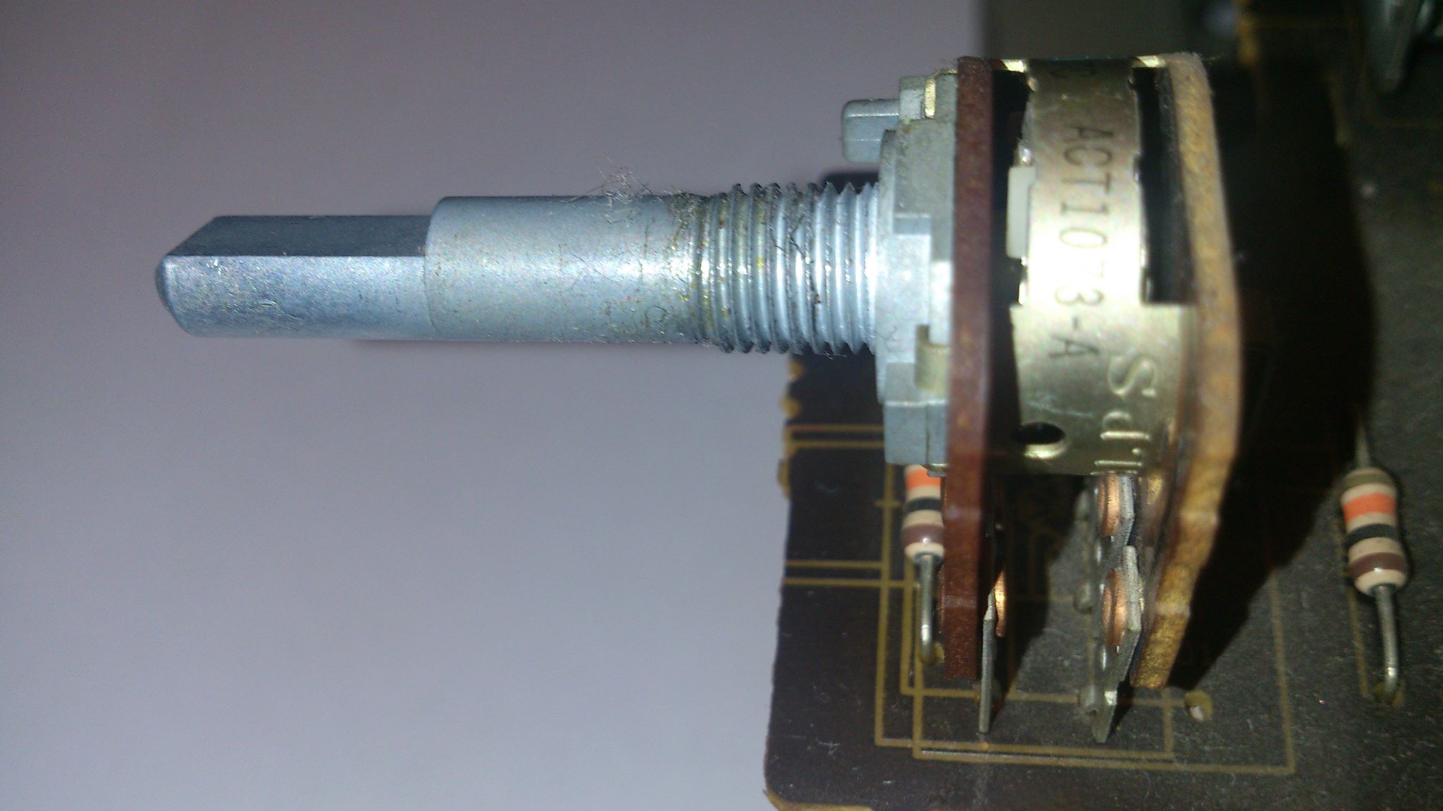 Захрипел потенциометр на усилителе Pioneer А410. Потенциометр ALPS ACT1073-A 227C с тонкомпенсацией, 8 ног, 100ком, шток прибл. 27мм. Именно такие потенциометры сняты с производства. Полного аналога не нашел.