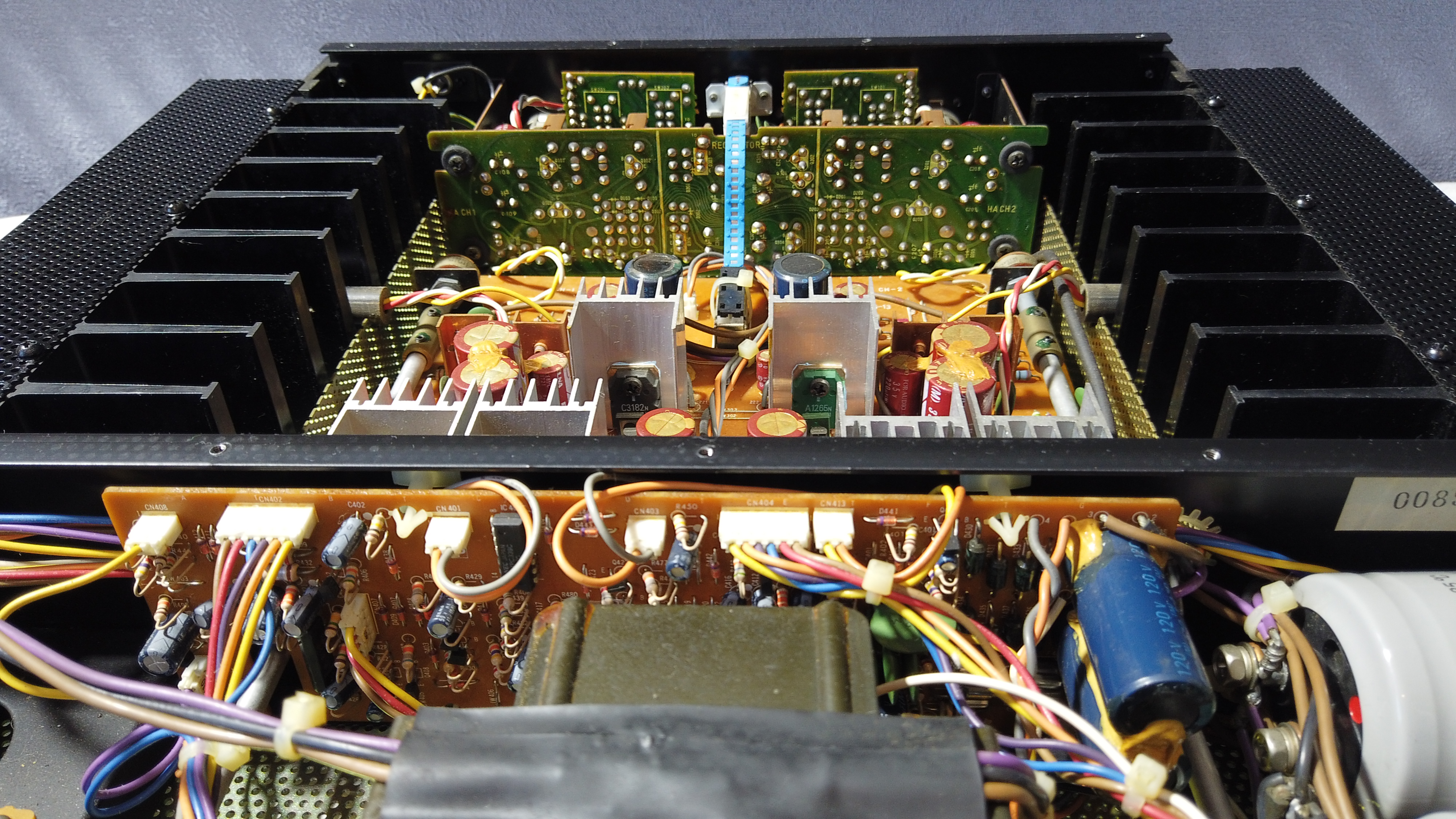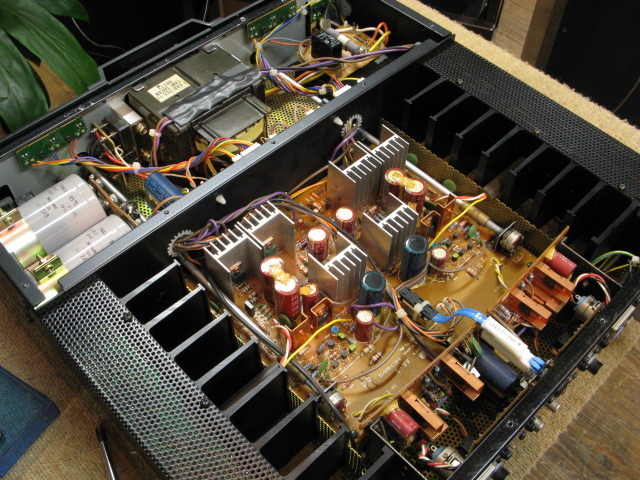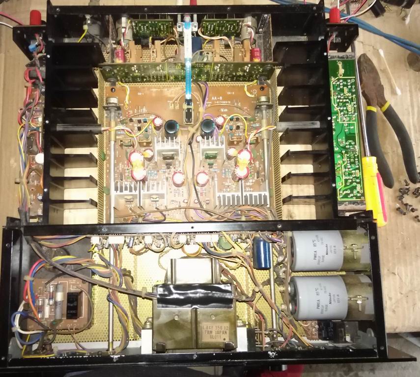 Из информации могу предоставить фотографии внутренностей и только. Скинул бы мануал либо схематехникуку, но увы, их не удается найти в интернете, а техническая информация, которая попадалась весьма смутна, будем полаться только на >50Вт стерео/8Ом, >70Вт Стерео 4Ом.