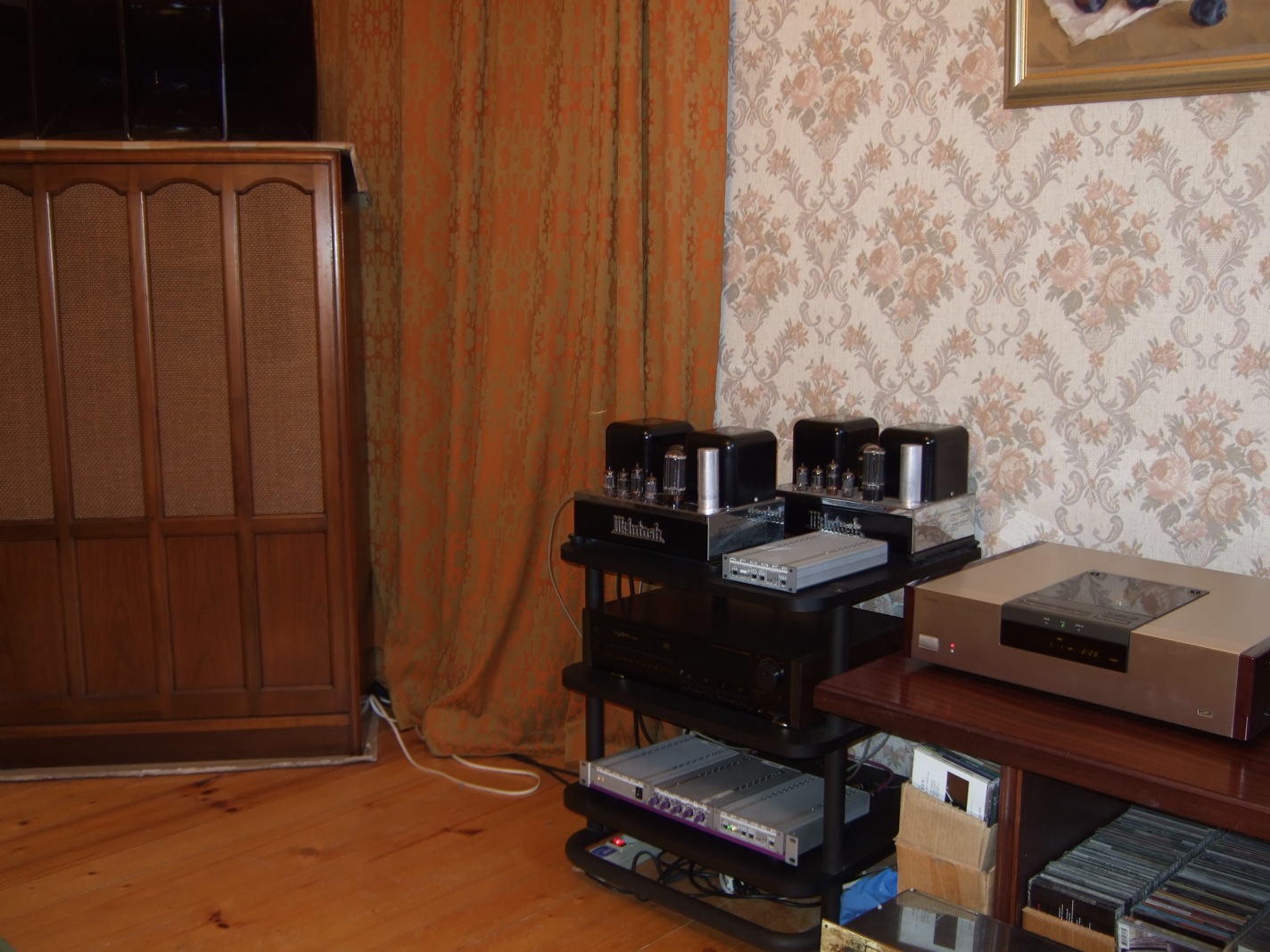 Итак, из закромов случайно всплыл длинный NoName кабель, выдался свободный вечер, и я решил попробовать подключить гравицапу к компу. Получился такой тракт: i-Mac > NoName TosLink > Apogee DA-1000 > WE > NoName переходник RCA-RCA > NoName кабель ~ 5 метров > McIntosh MC30 > Neumann > EV Patrician 800.