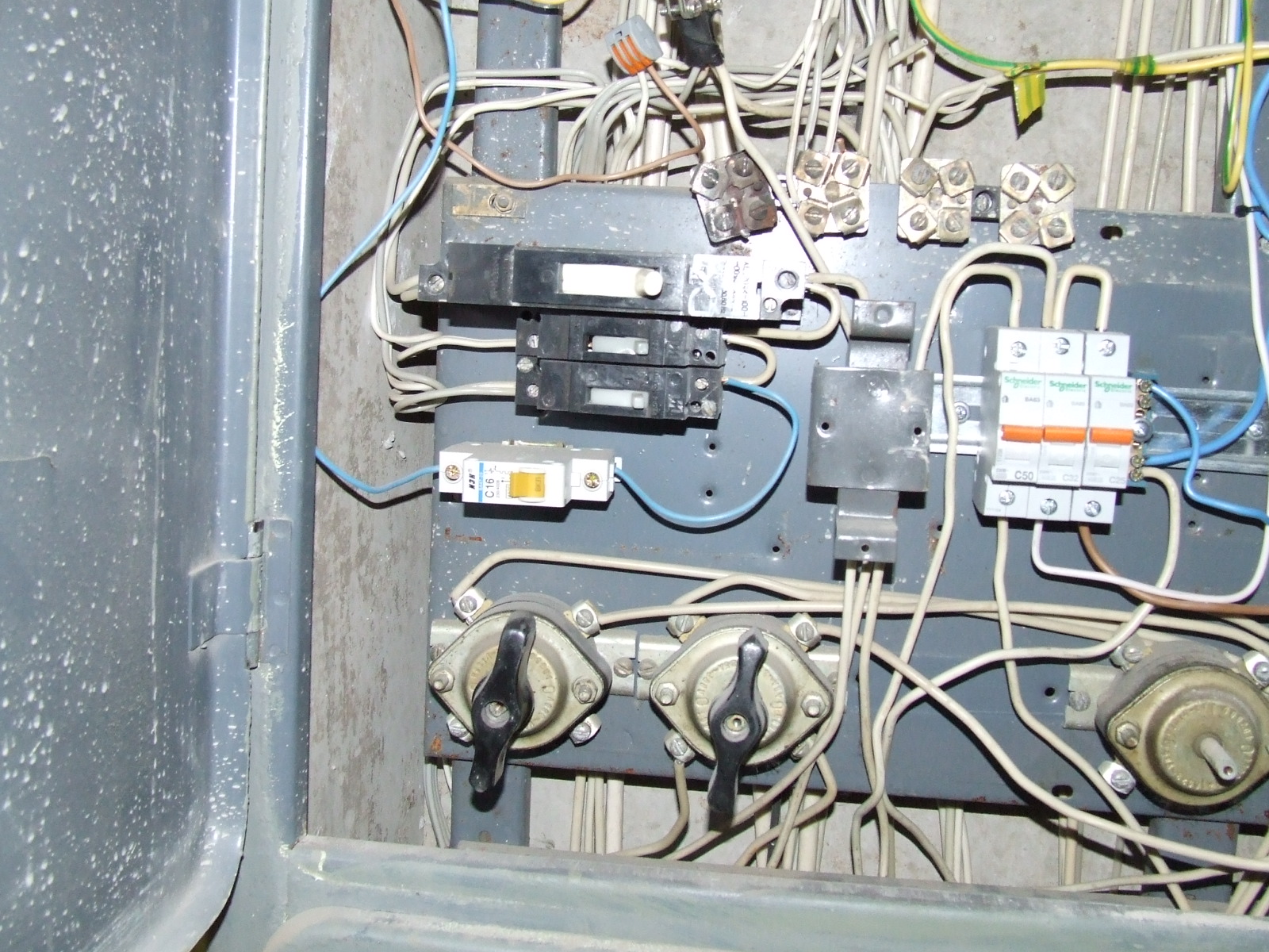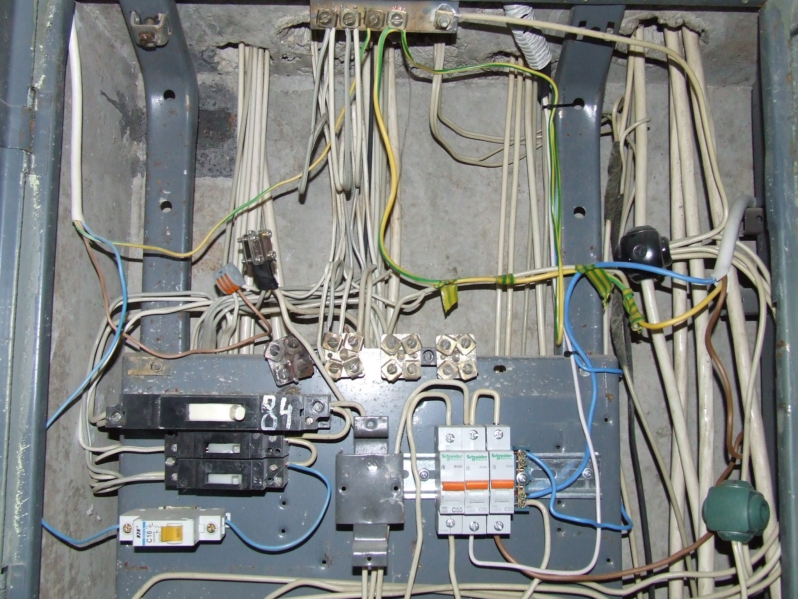 выкладываю фото щитка . Мои автоматы чёрного большего размера(84 написано -это общий) . снизу два чёрных- свет и розетки и один белый стиральная машина. Вопрос откуда взять фазу на новые автоматы? С большого чёрного ?Фаза на автомат на машинку подключена синим проводом(электрик делал!!)