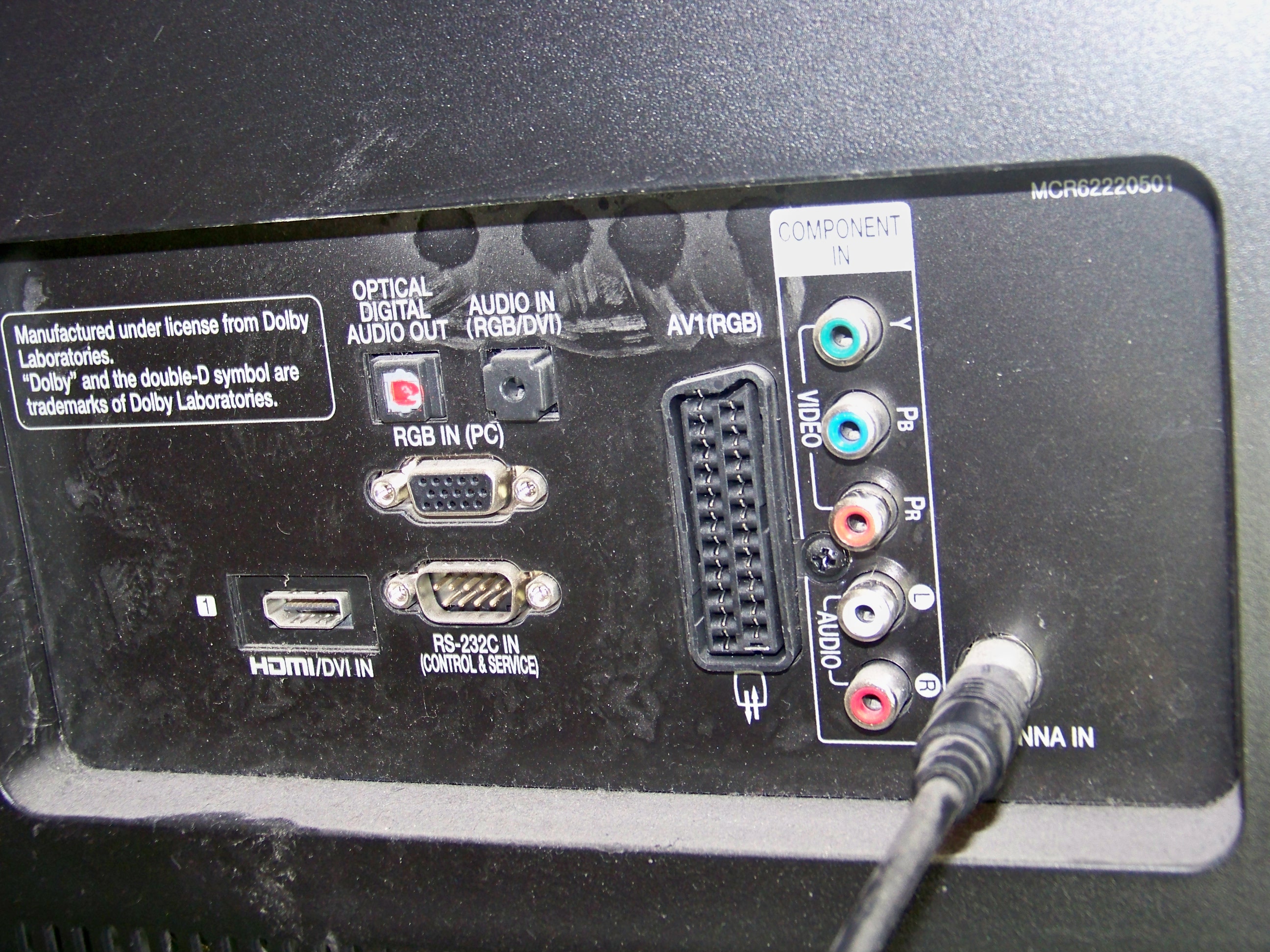 2. Имеющийся оптический кабель выткнуть из ДВД или куда он там подключен и воткнуть в выход ТВ (фото 100_8670.JPG самый левый/верхний разъемчик «Optical digital audio out»). Ессно, в ресивере оптический кабель оставить, где и был. При просмотре фильмов с ноута, вход на ресивере включать тот же, самый, что и был до этого с ДВД.