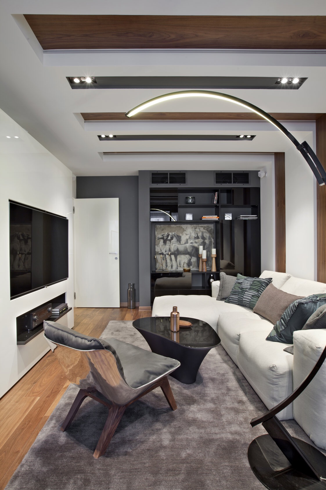 Я бы поставил саб слева или справа от стойки с ТВ и аппаратурой, прямо на пол, тем более там такие уВас есть уголочки.