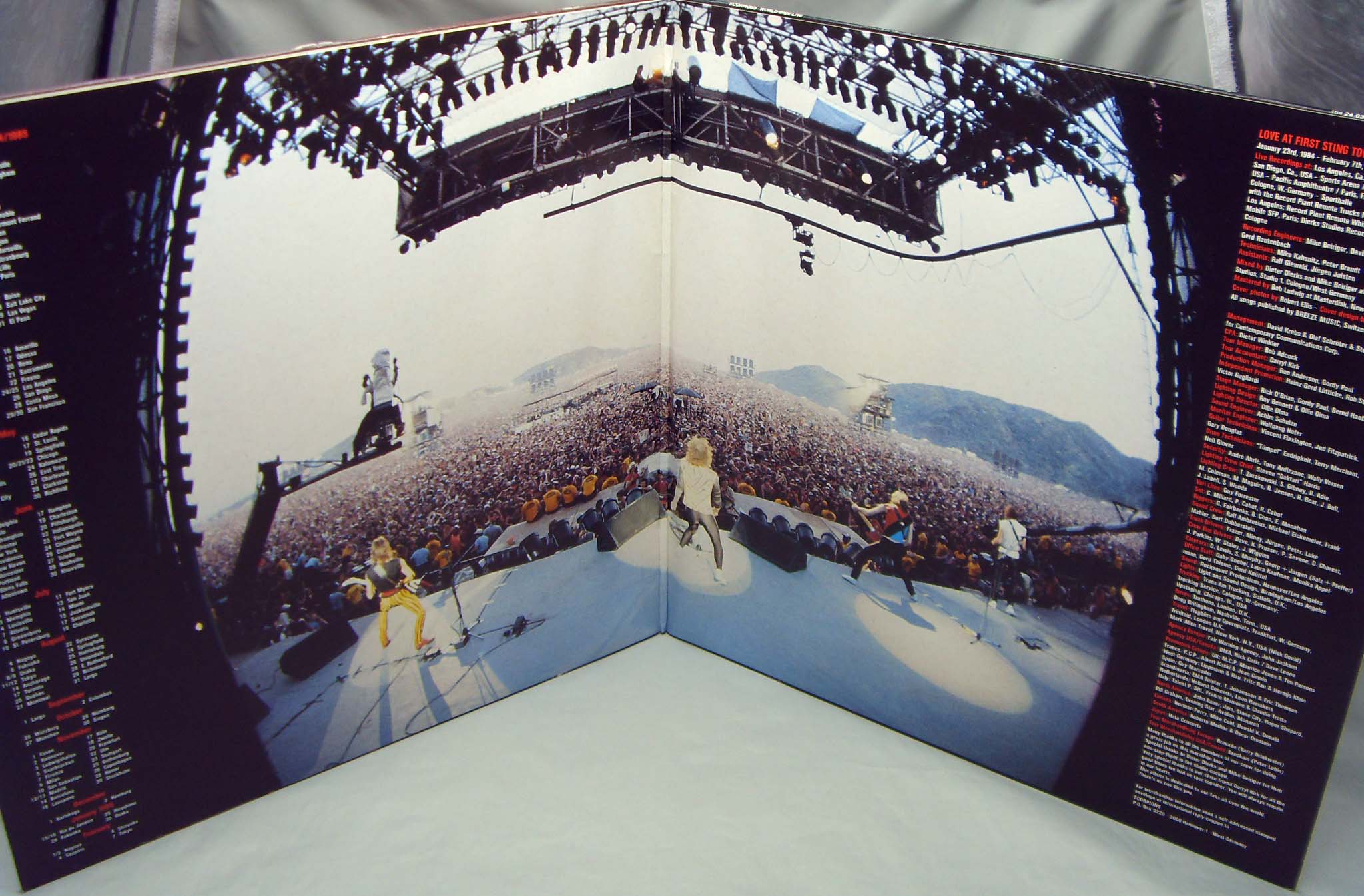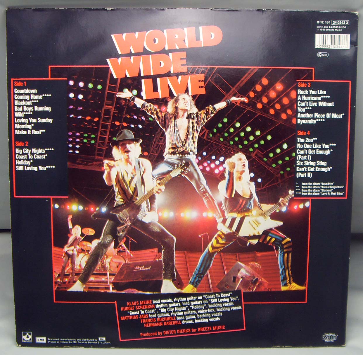 Жестянка хардовая, концертная Scorpions – World Wide Live Label: Harvest – 166-24 0343 1 Format: 2 × Vinyl, LP Country: Europe Released: 1985 Genre: Rock Style: Hard Rock Tracklist A1 Countdown 0:31 A2 Coming Home 3:15 A3 Blackout 3:40 A4 Bad Boys Running Wild 3:41 A5 Loving You Sunday Morning 4:36 A6 Make It Real 3:27 B1 Big City Nights 4:49 B2 Coast To Coast 4:40 B3 Holiday 3:12 B4 Still Loving You 5:44 C1 Rock You Like A Hurricane 4:04 C2 Can't Live Without You 5:28 C3 Another Piece Of Meat 5:28 C4 Dynamite 7:05 D1 The Zoo 5:46 D2 No One Like You 4:07 D3 Can't Get Enough (Part 1) 1:59 D4 Six String Sting 5:16 D5 Can't Get Enough (Part 2) 1:52 Рецензия Darkside.ru Музыкантов Scorpions можно поздравить с крайне удачным выбором времени для выпуска своего второго концертного альбома "World Wide Live". Самый пик популярности, полные стадионы верных поклонников, миллионные продажи дисков, почет везде и всюду - именно такая атмосфера царила вокруг группы в середине 80-ых. Оглушительный успех альбома "Love At First Sting" и крайне успешные мировые гастроли в поддержку этого релиза просто-таки кричали о необходимости выпуска нового "живого" диска. Очевидно, после выступления группы на легендарном фестивале Rock In Rio в январе 1985 года, Дитер Диркс и принял окончательное решение о выпуске этого релиза. Основной посыл "World Wide Live" - конечно же, подчеркнуть все достоинства четырех предыдущих альбомов "Скорпов" (ранние диски, естественно, в счет не брались) и доказать, что песни с них на концертах звучат ничуть не хуже студийных версий. Собственнно, с этой задачей ребята справились на твердые пять баллов. Группа играет просто великолепно, все инструменты довольно четко прослушиваются в миксе, толпа фэнов ревет от восторга, и во всю мощь подпевает любимым музыкантам на таких хитах, как "Big City Nights", "Rock You Like A Hurricane" или "Can't Live Without You". Сет-лист довольно полным образом охватывает четыре "классических" альбома Scorpions 1979-1984 годов, причем некоторые композиции сыграны отлично от своих студийных собратьев. Так, "Coming Home" и "Holiday" представлены в традиционно сокращенных для "живого" выступления версиях, а "Can't Get Enough" разделена на две части, между которыми примостилось гитарное соло Маттиаса Ябса. Продолжительность "World Wide Live" вплотную приближается к предельным 80 минутам, так что и с этой стороны придратся не к чему. Пожалуй, единственный минус этого замечательного концертника - это его "многостаночность". Записывали материал в течении нескольких месяцев, в разных городах и странах, в результате чего полноценная "концертная" атмосфера несколько расшатывается, хотя (слава Богу!) - смикшировано все это на славу, без всяких фэйд-аутов. В итоге - "World Wide Live" можно смело назвать отличным концертником, вполне подтверждающим культовый статус Scorpions в 80-ых.