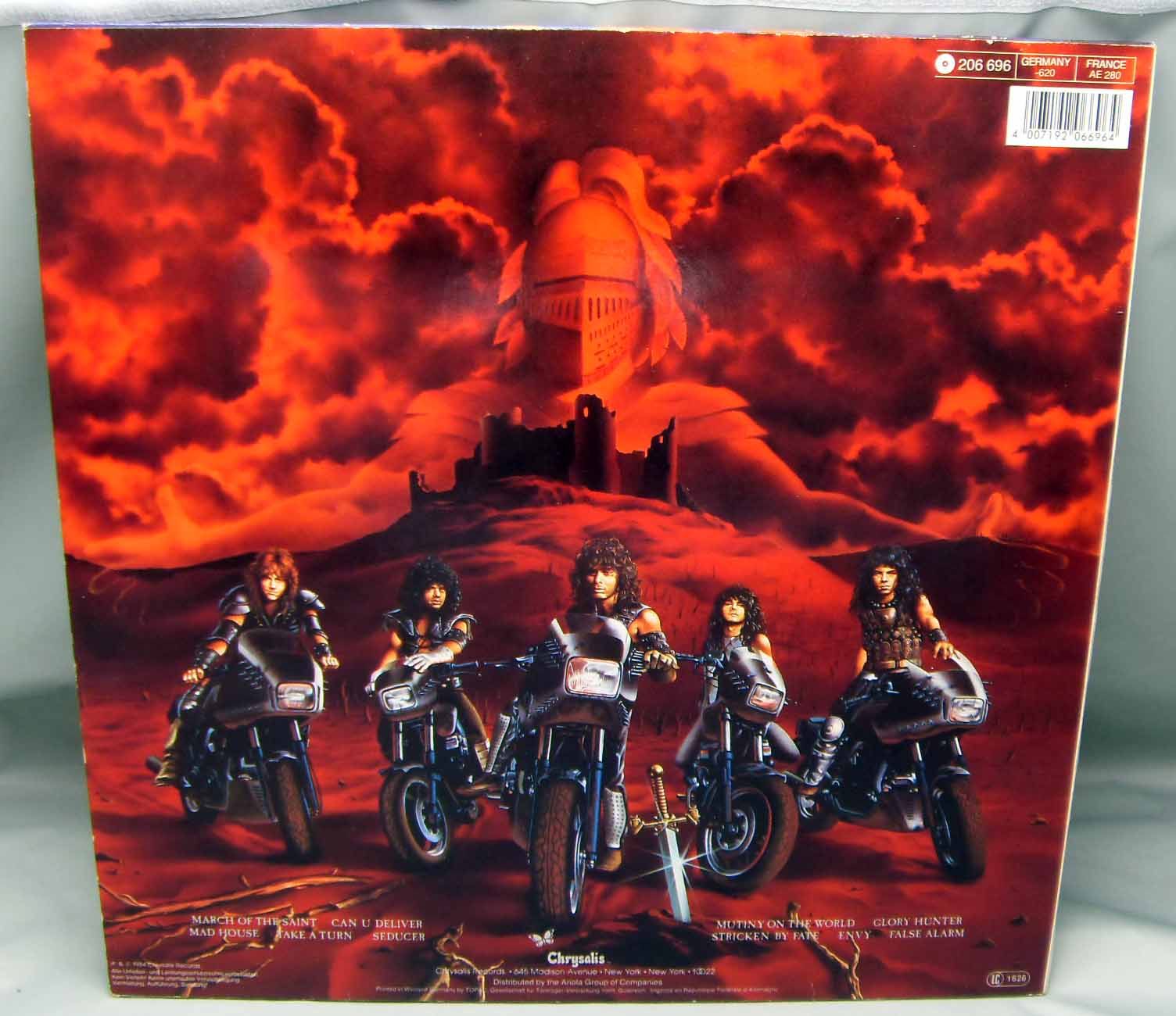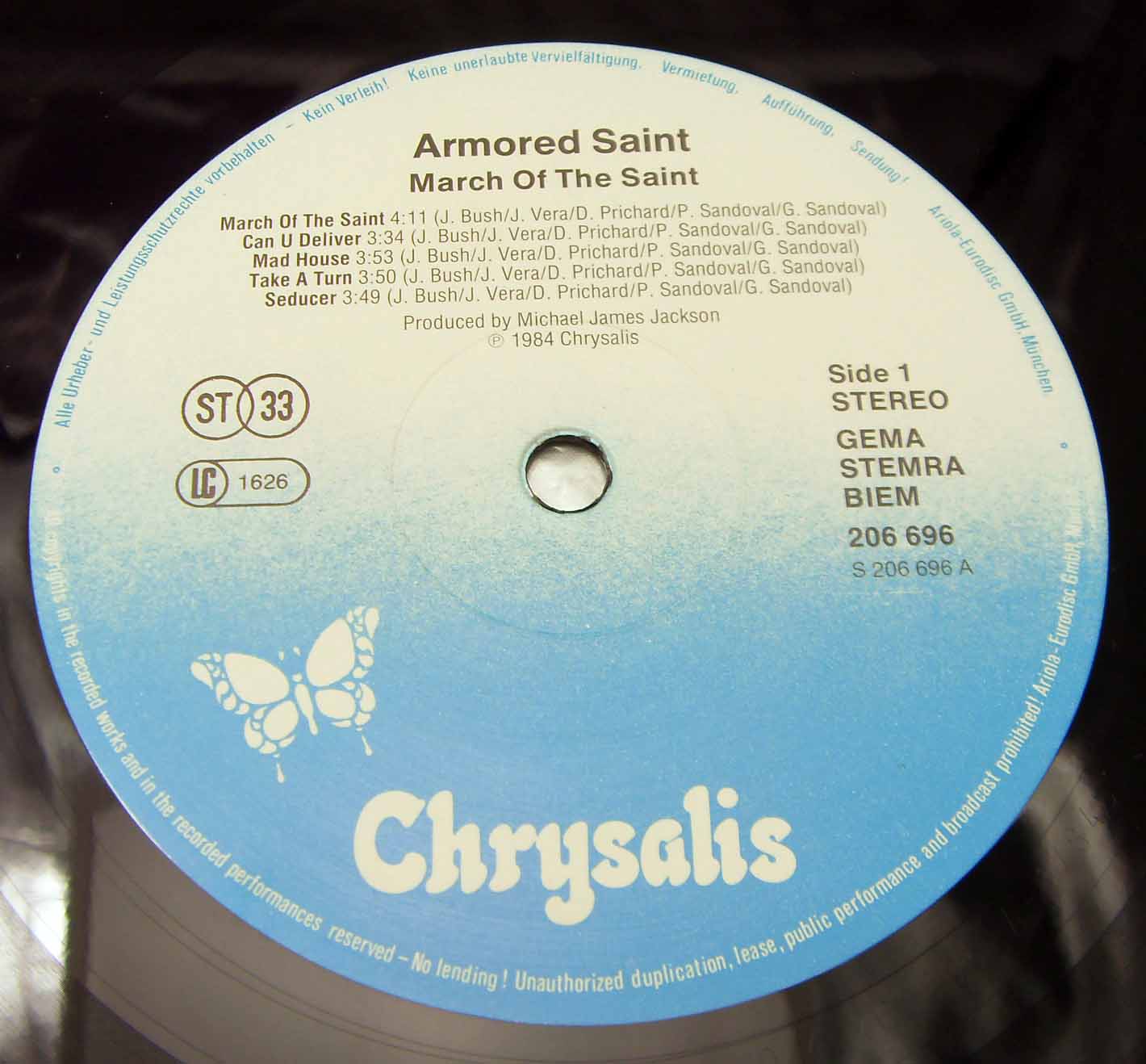 Armored Saint – March Of The Saint Label: Chrysalis – 206 696 Format: Vinyl, LP, Album Country: Europe Released: 1984 Genre: Rock Style: Heavy Metal Tracklist A1 March Of The Saint 4:11 A2 Can U Deliver 3:34 A3 Mad House 3:53 A4 Take A Turn 3:50 A5 Seducer 3:49 B1 Mutiny On The World 3:29 B2 Glory Hunter 5:09 B3 Stricken By Fate 3:30 B4 Envy 2:56 B5 False Alarm 4:14