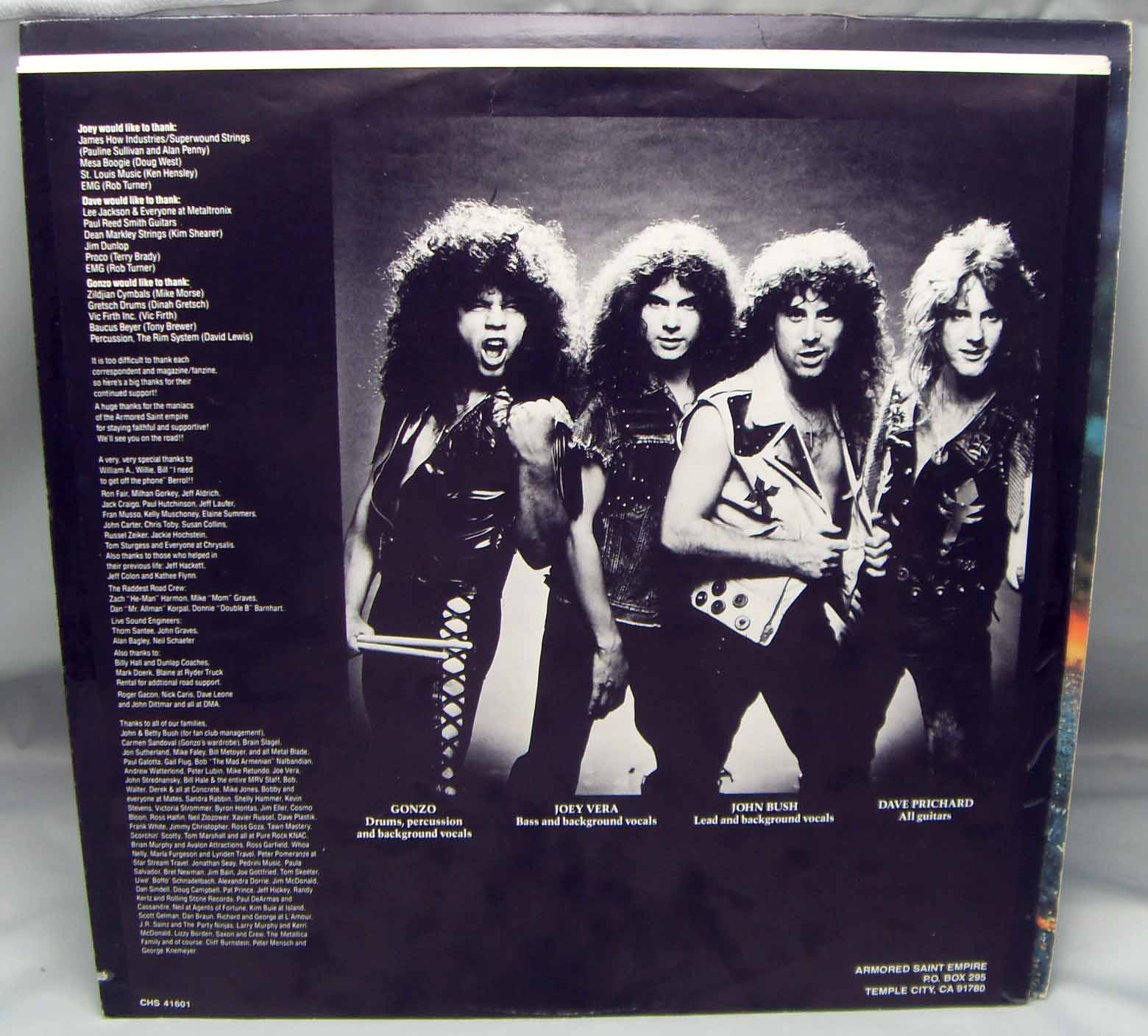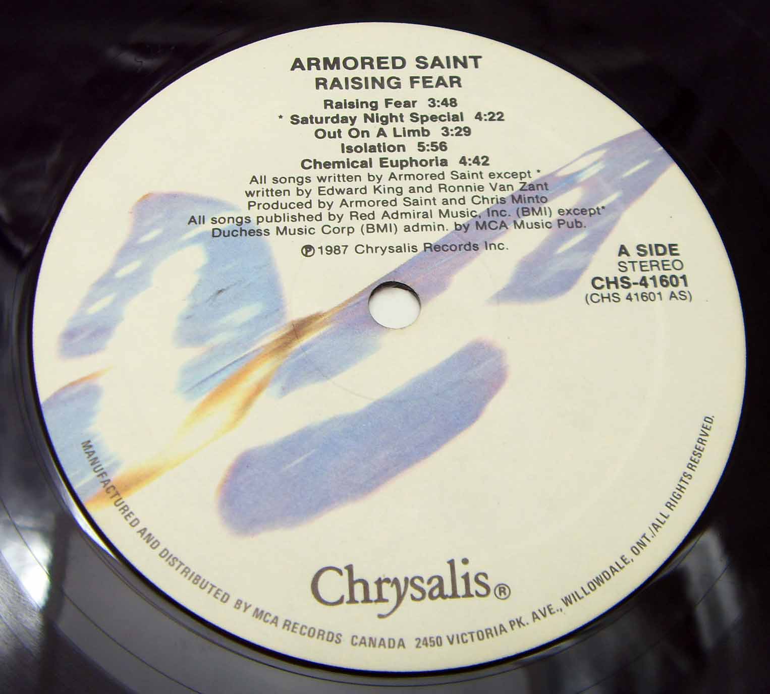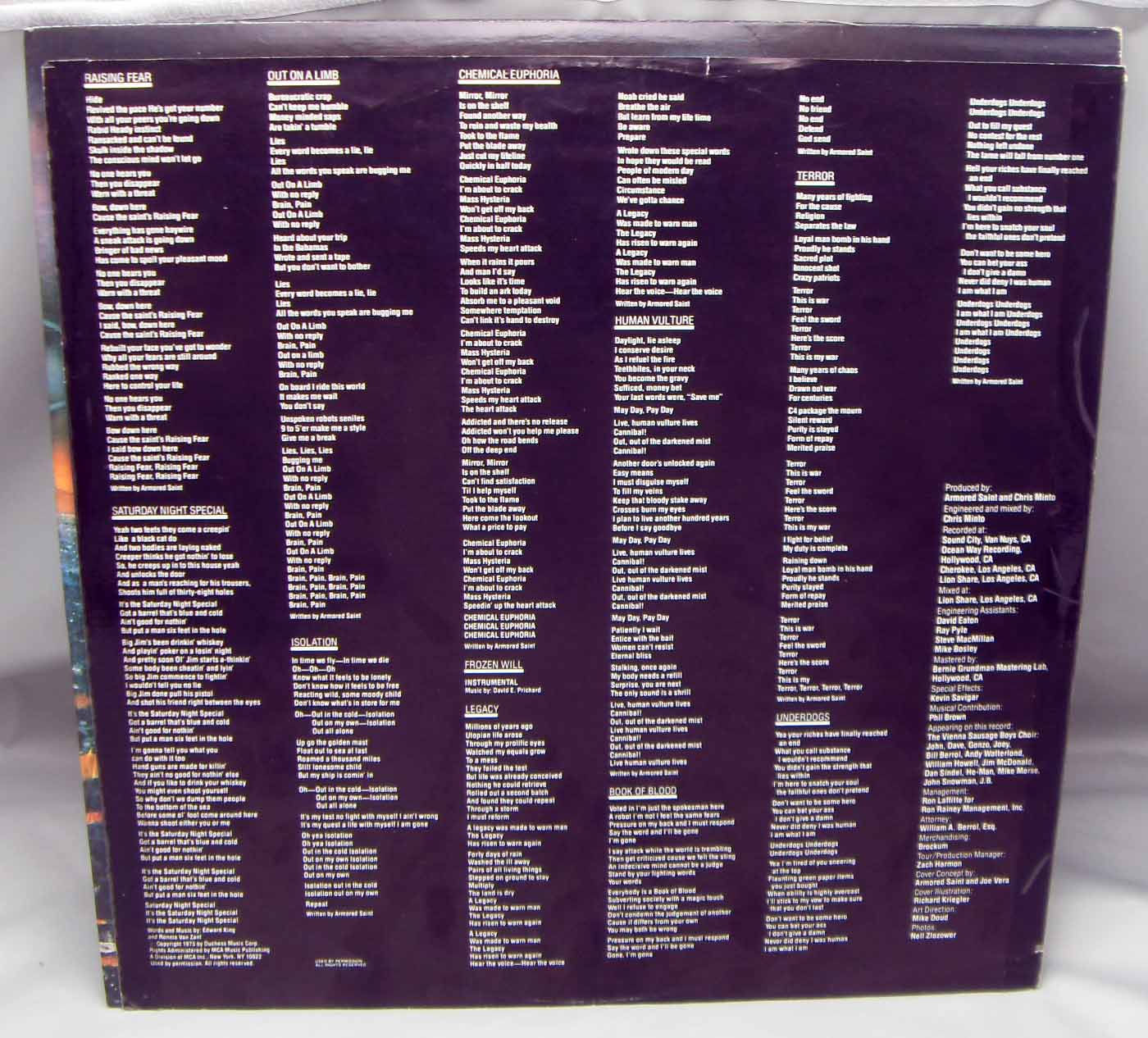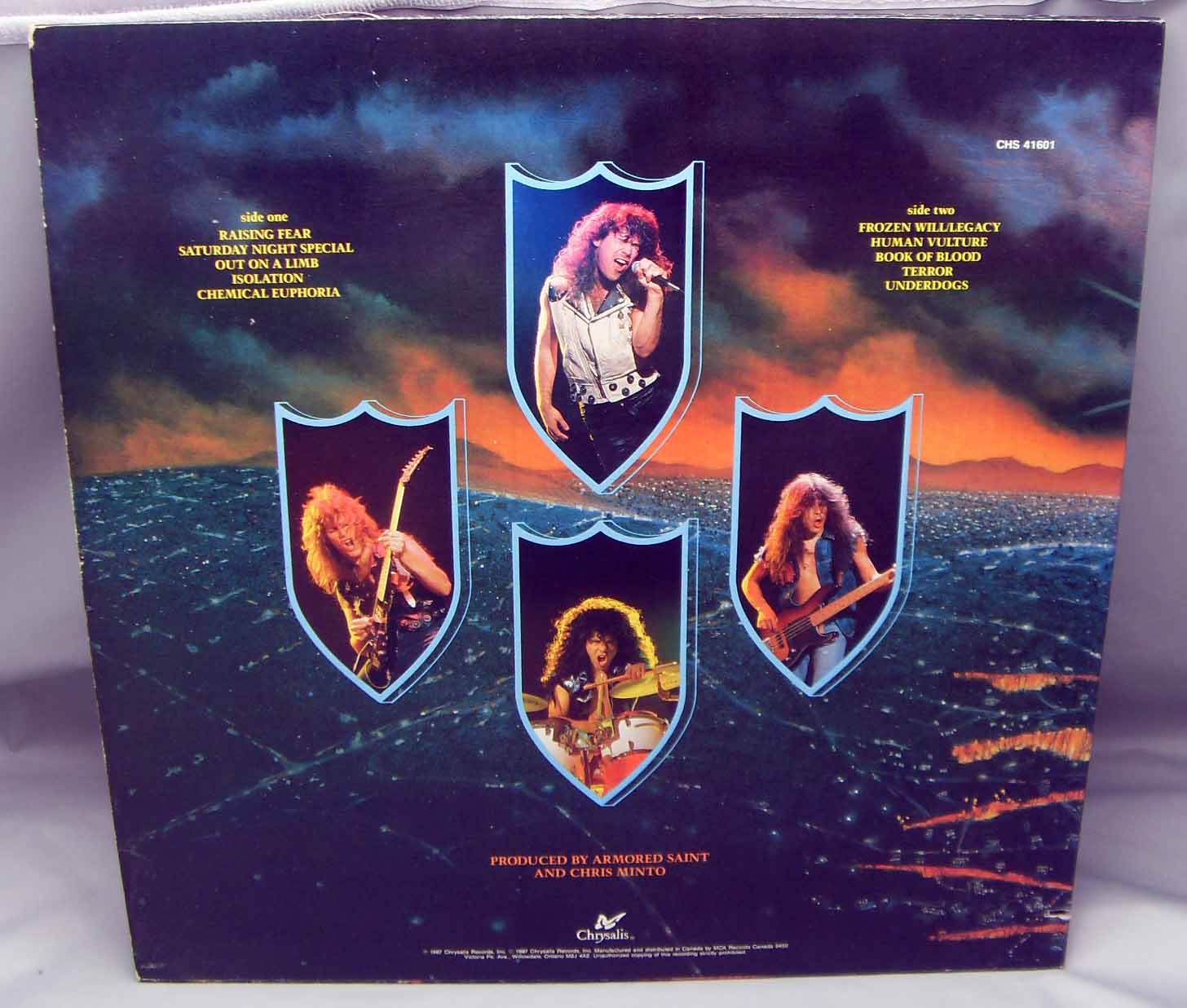 Armored Saint – Raising Fear Label: Chrysalis – CHS 41601 Format: Vinyl, LP, Album Country: Canada Released: 1987 Genre: Rock Style: Speed Metal, Heavy Metal Tracklist A1 Raising Fear A2 Saturday Night Special A3 Out On A Limb A4 Isolation A5 Chemical Euphoria B1 Frozen Will/Legacy B2 Human Vulture B3 Book Of Blood B4 Terror B5 Underdogs